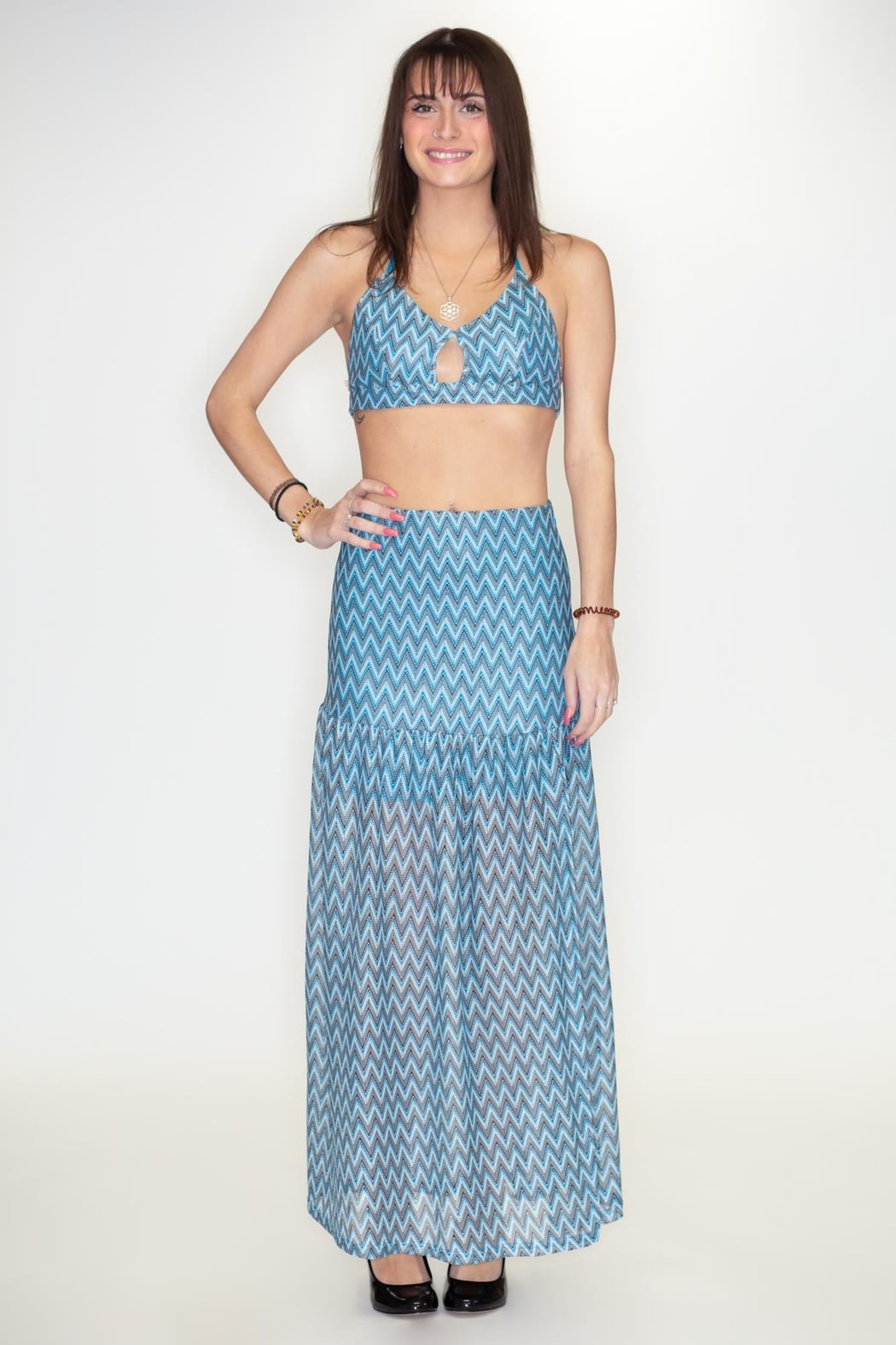 Covered in a flattering geometric print, the crop top is fashioned with a tying halter v-neck and flirty front cutout. High-waisted skirt wraps around your hips beautifully, before dropping down into a flowy silhouette with long off-center slit.