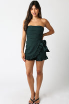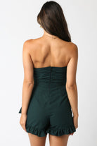 Turn up the heat in this cute but spicy Gingham Wrap Romper. The black-green pattern gives it a sultry edge, while the strapless neckline keeps things clean and confident. The fitted bodice shows off your shape, and the ruffled wrap-style skirt brings the playful, leg-lengthening moment. Finished with a side bow that adds just enough drama. Perfect for nights out, birthday plans, or anytime you want a fun, flirt outfit that still looks chic. Features: - Straight neckline - Zipper closure - Ruffled hem - Black green color Pair with strappy heels, a mini bag, and gold hoops for a hot-girl evening look. Fabric: 55% Linen, 45% Cotton Model is wearing a size Small.