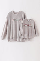Add some cozy, blessed vibes to your wardrobe with this grey velvet mom&me sweatshirt. Featuring stylish embroidery and a matching set, this unique top is perfect for showing off your playful, quirky side. Bless up!