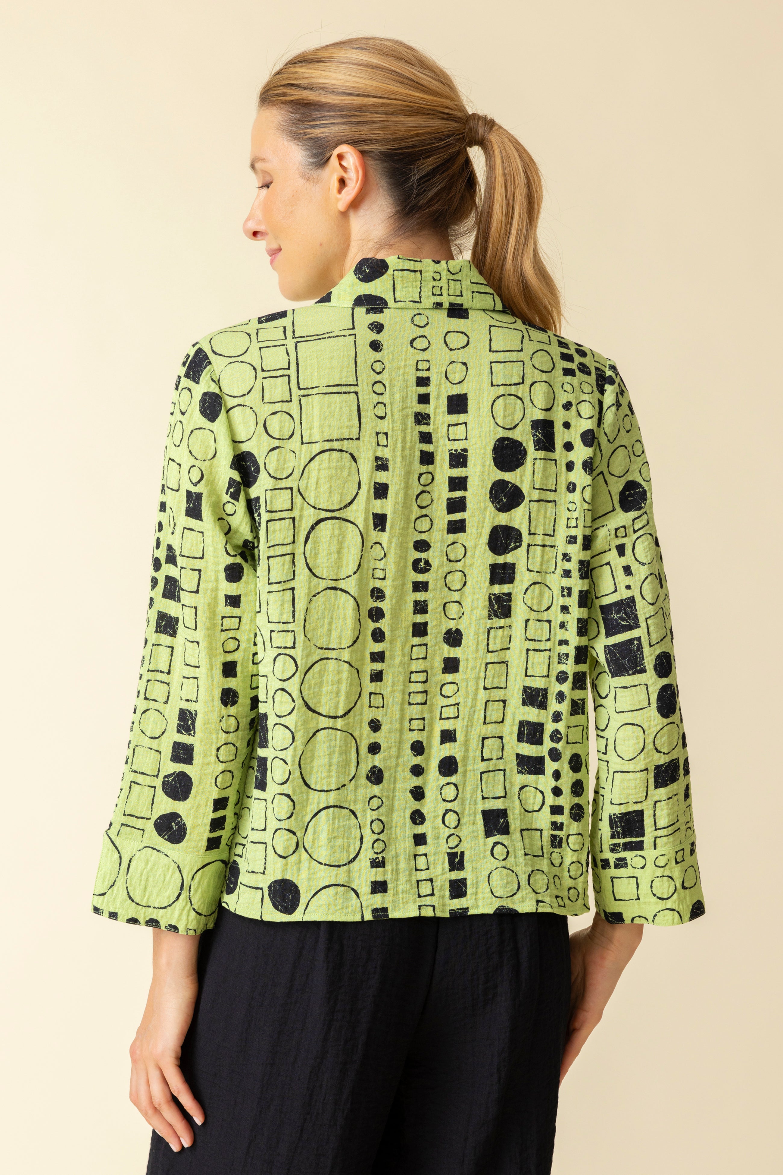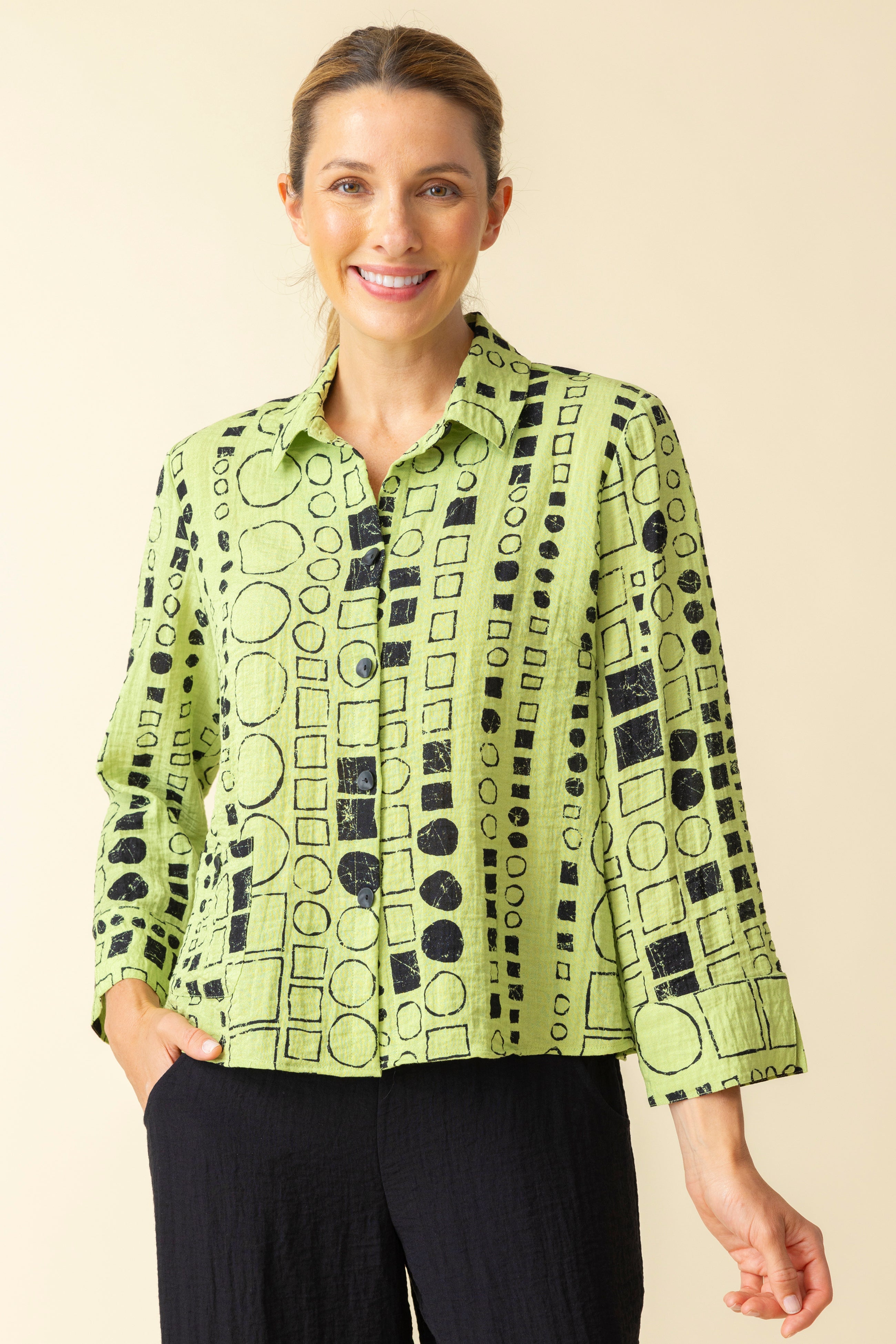 Effortless style meets everyday comfort with the Habitat Express Travel Circle Square Jill Shirt in Leaf. Featuring an exclusive print on a slightly shaped silhouette, this shirt offers a flattering fit that’s perfect for any occasion. The lightweight rayon and nylon blend has a subtle crinkle texture that naturally hides wrinkles. Thoughtful details like a front pocket and feminine cuff slits add a polished touch, making it an ideal choice for travel or day-to-day wear. Product Details: Travel-friendly, wrinkle-resistant fabric Exclusive print with a slight crinkle texture Front pocket for added style and function Feminine cuff detail with slit accents Slightly shaped for a flattering fit Brand: Habitat Style Number: 34190 Stay polished and comfortable, whether you're on the go or enjoying a relaxed day out.