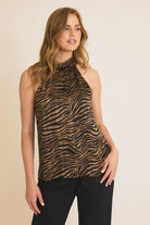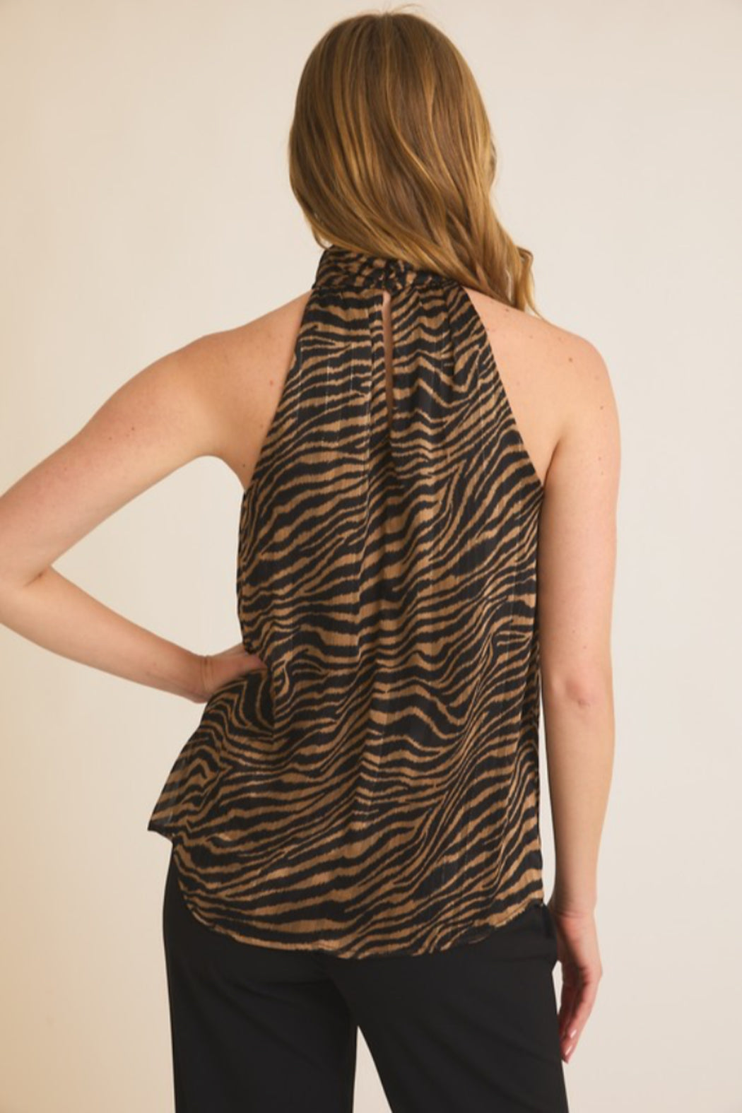 The Halter Neck Animal Print Top is a sleek, sleeveless silhouette in a bold zebra-inspired print with a softly textured, pleated finish. Its high halter neckline with two button closure in the bck creates a polished look that elevates jeans or tailored trousers for evening plans.