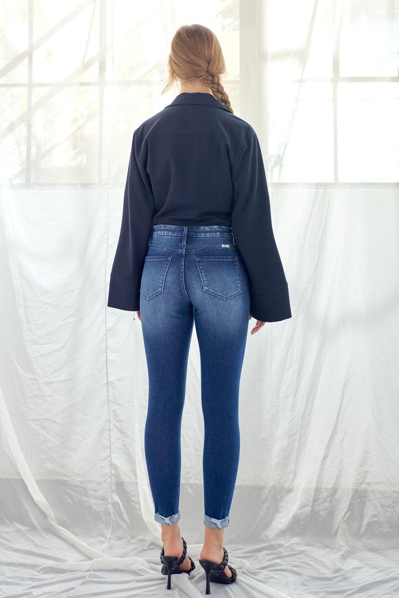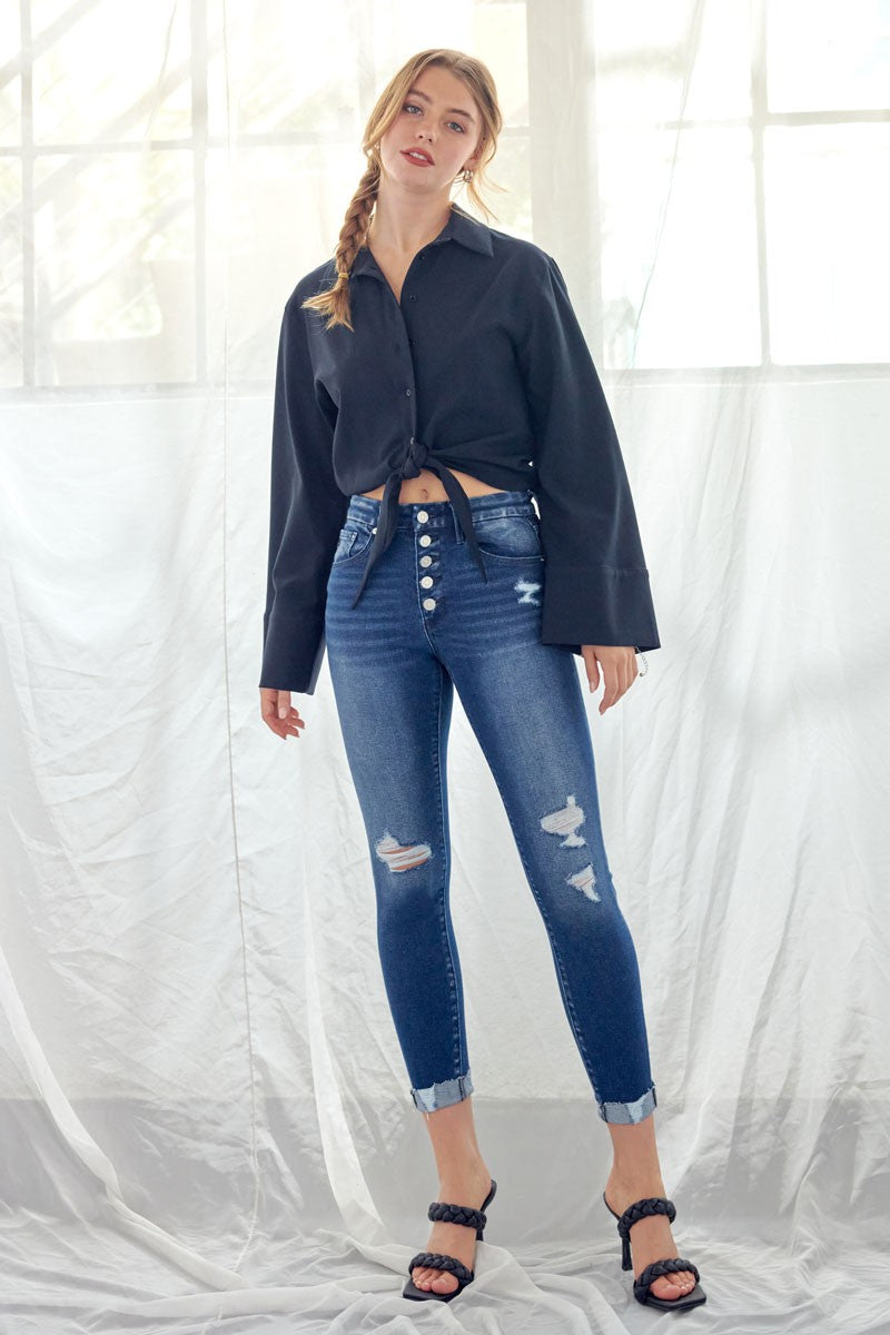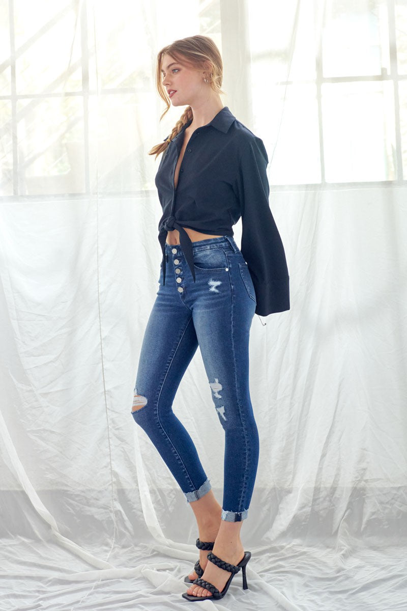 HIGH RISE BUTTON DOWN CUFFED ANKLE SKINNY. STRETCHINESS LEVEL #3