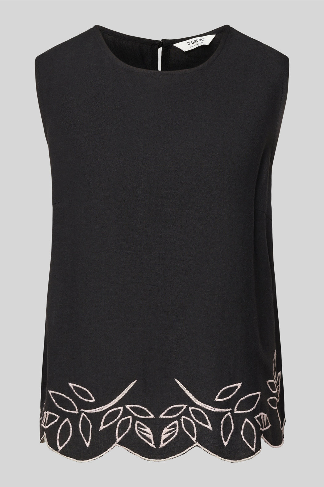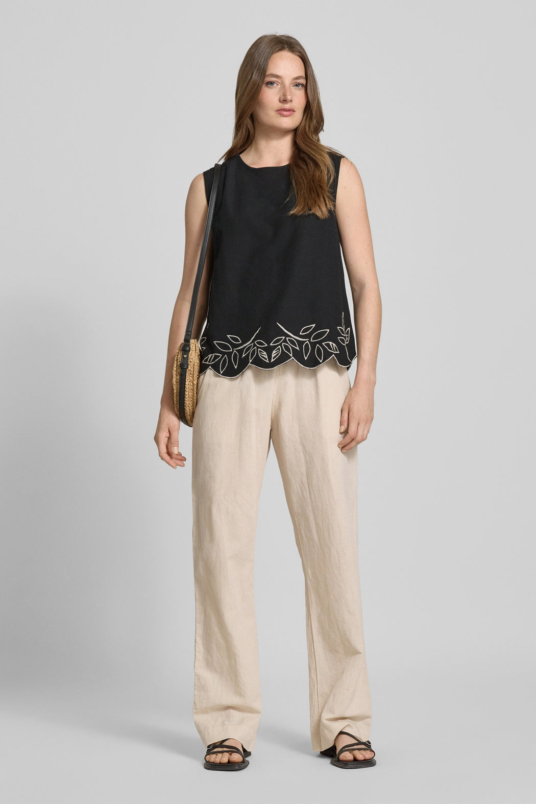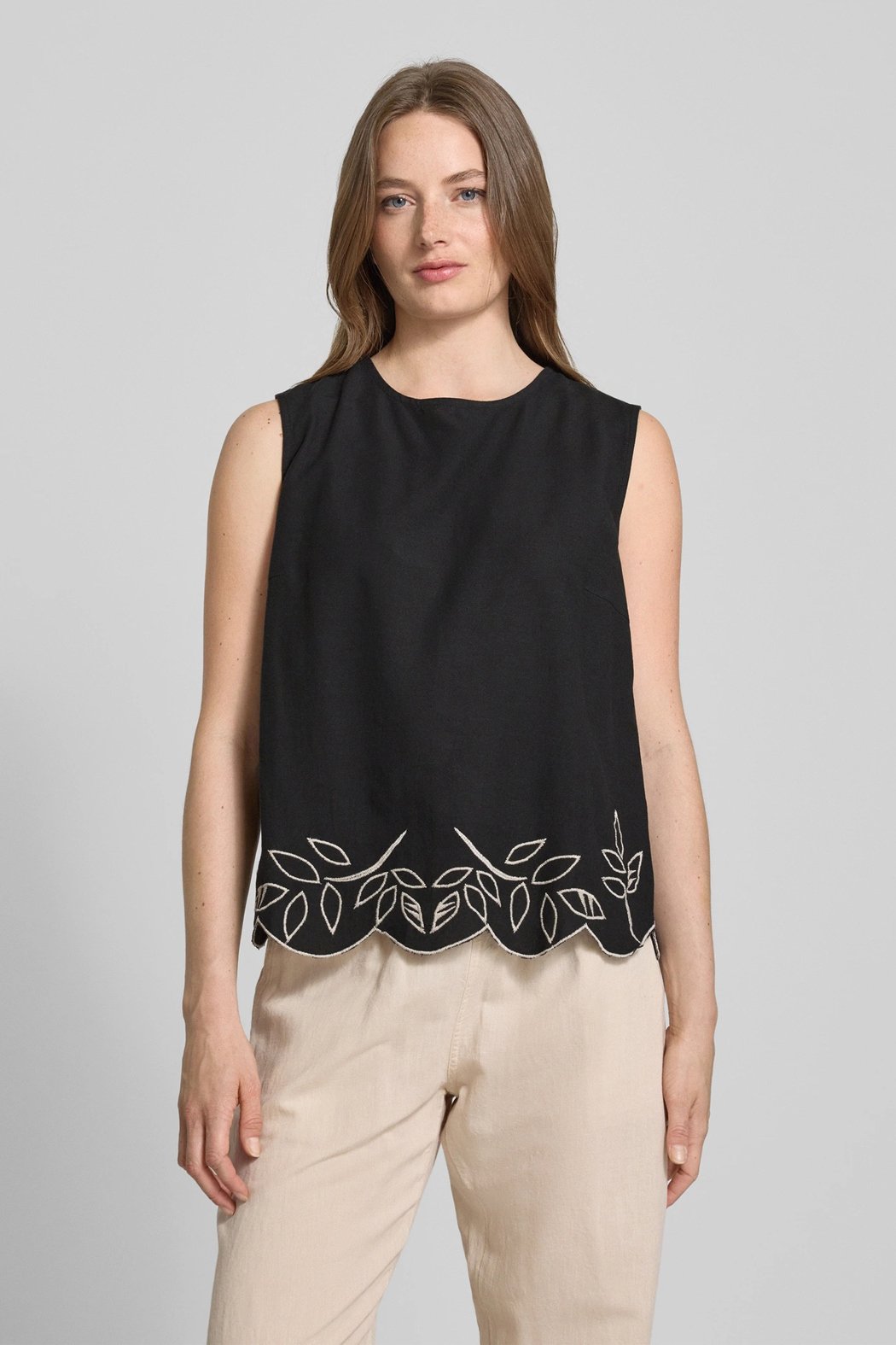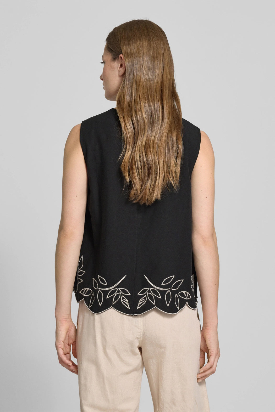 This black linen blouse is effortlessly chic, features include a relaxed sleeveless silhouette, and scalloped hem with intricate leaf embroidery. Pair with denim or linen! Follow @lunaboutiquecanton on instagram and DM us with any questions :)