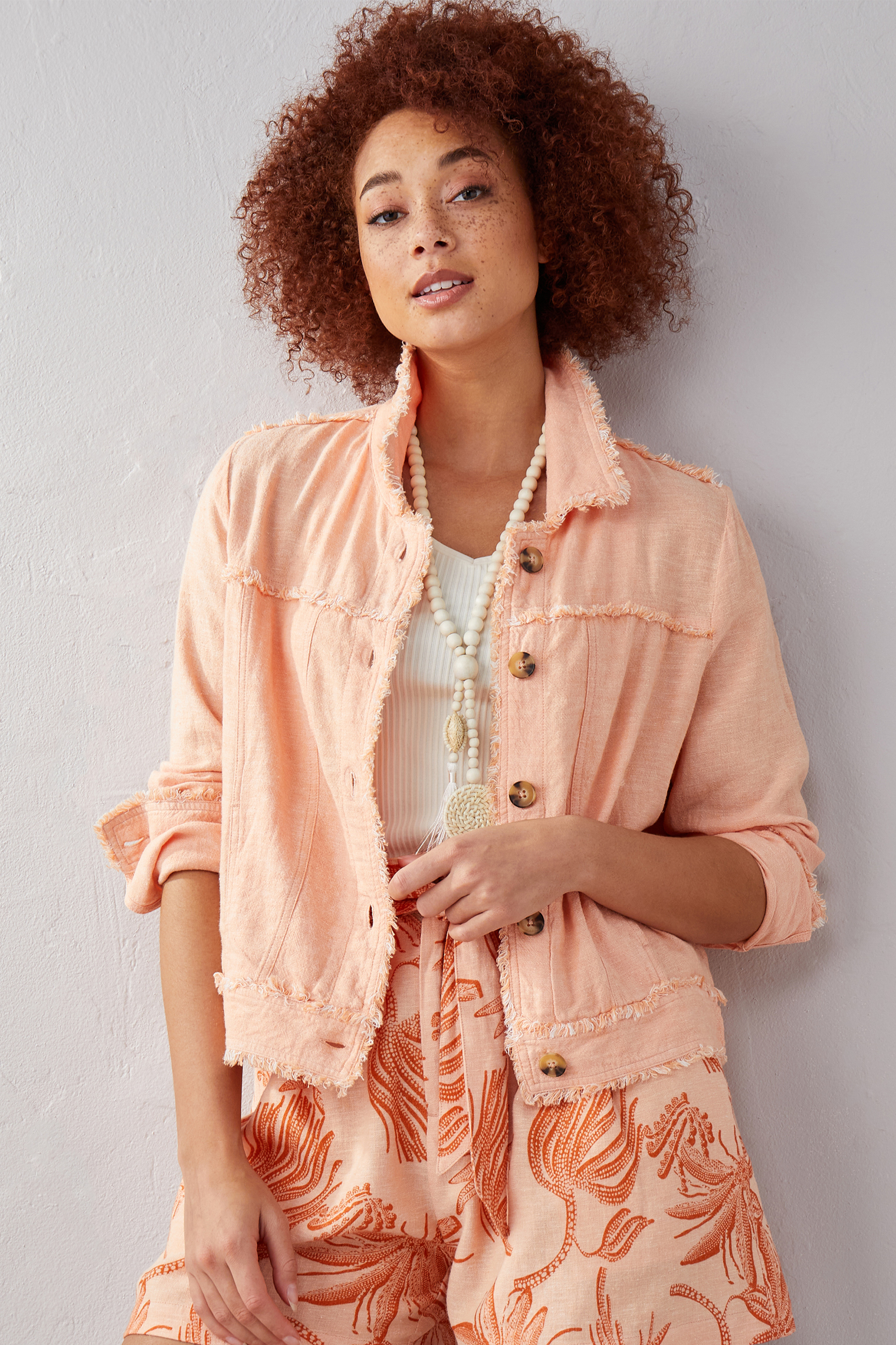 A denim inspired linen jacket with raw finished edge. Lightweight breathable fabric with an easy fit silhouette, making this the perfect layering jacket for all your journeys this season. model height approx 5ft 9in, body length approx 25-27in, sleeve length approx 31-32in.
