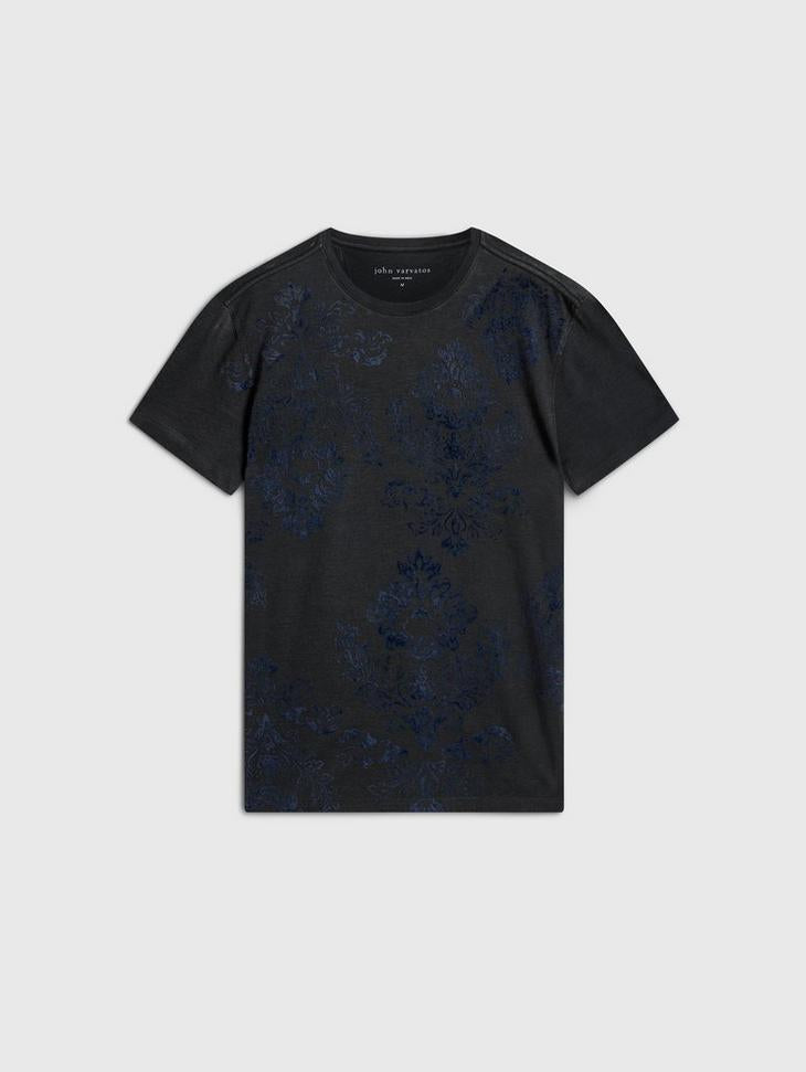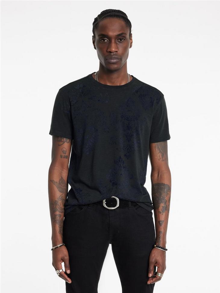 Introducing the John Varvatos Paisley Crew Tee, part of our Fall '24 collection. This unique t-shirt boasts a textured, flocked paisley pattern, created with an innovative cold dye wash and burnout fabric technique. Each tee is one-of-a-kind, making it a truly special addition to your wardrobe. Perfect for blending with denim or adding a touch of distinction to your tailored look.