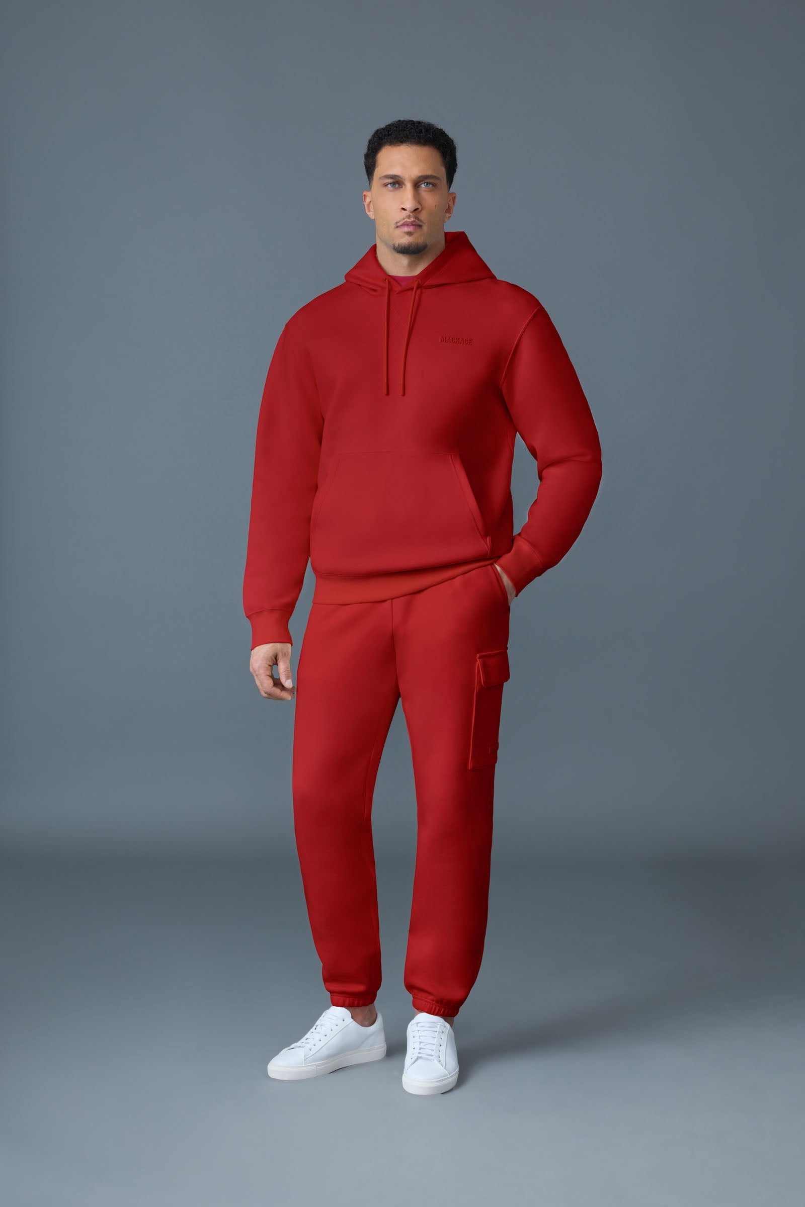 The KOLTON Double-Face Jersey Logo Hoodie is your new go-to for cozy, cool vibes. Made from ultra-soft double-face jersey with a relaxed fit, it’s perfect for layering indoors or out. With a kangaroo pocket and adjustable hood, it’s all about comfort and function. Ribbed trims and a subtle silicone "MACKAGE" logo add a sleek touch to your everyday look. Whether you’re hitting the streets or lounging around, this hoodie keeps it effortlessly stylish and comfy.