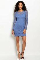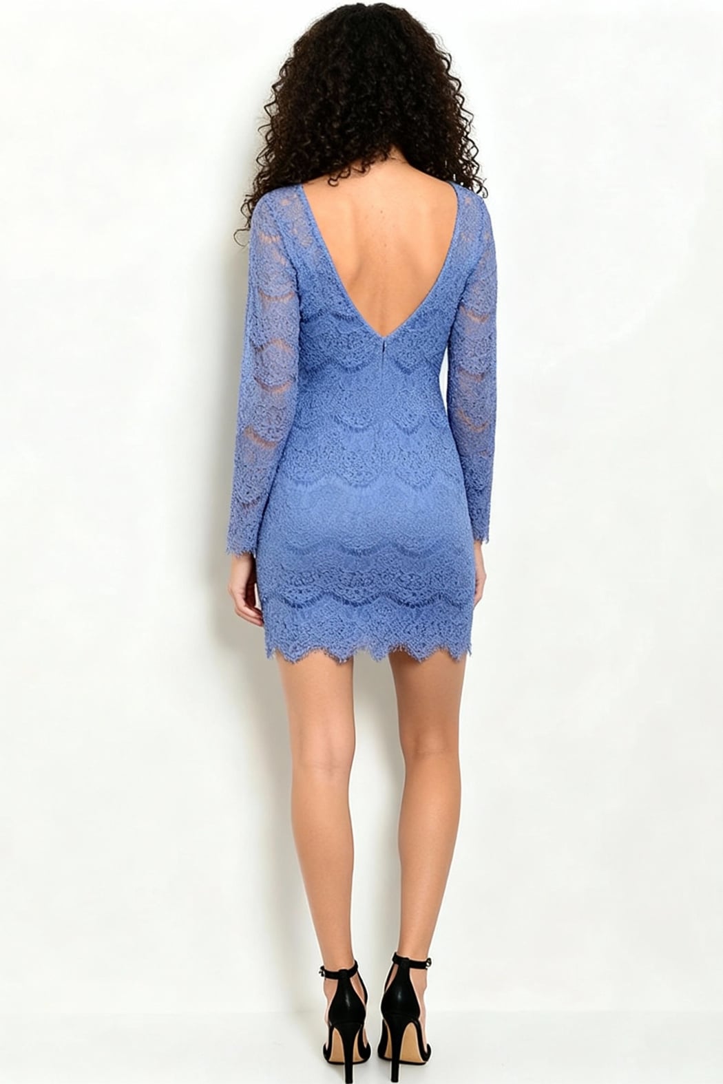 This elegant cocktail dress showcases a timeless lace overlay design with intricate scalloped details at the hemline and sleeve edges for a refined touch. The indigo blue hue adds a sophisticated flair, while the lower V-shaped back and scoop neckline enhance its feminine appeal. Designed in a sheath style, it features a full interior lining for comfort and a flattering silhouette, material has stretch. Perfect for formal events, evenings out, or special occasions, it pairs effortlessly with high heels or ankle boots for a versatile look. Size Small L: 33" B: 17" W: 14" H: 17" / Size Medium L: 34" B: 18" W: 15" H: 18" / Size Large L: 35" B: 19" W: 16" H: 19"