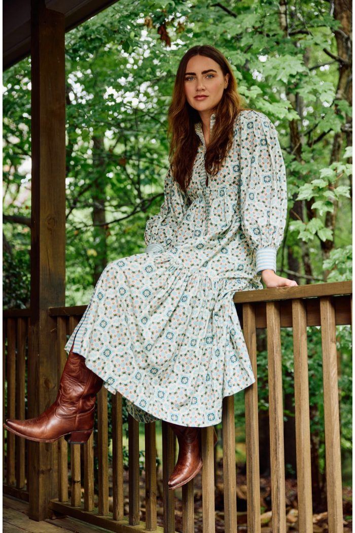 Laura Long Sleeve Dress - Quatrefoil Blue & Ivory