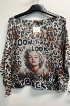 Bold, confident, and unapologetically stylish — this Italian one-size sweater blends fierce leopard print with an iconic glamour graphic and the statement “Don’t Look Back.” The soft, lightweight knit drapes effortlessly, creating an easy, relaxed silhouette perfect for everyday chic or a night-out edge. A standout piece for anyone who loves fashion with attitude.