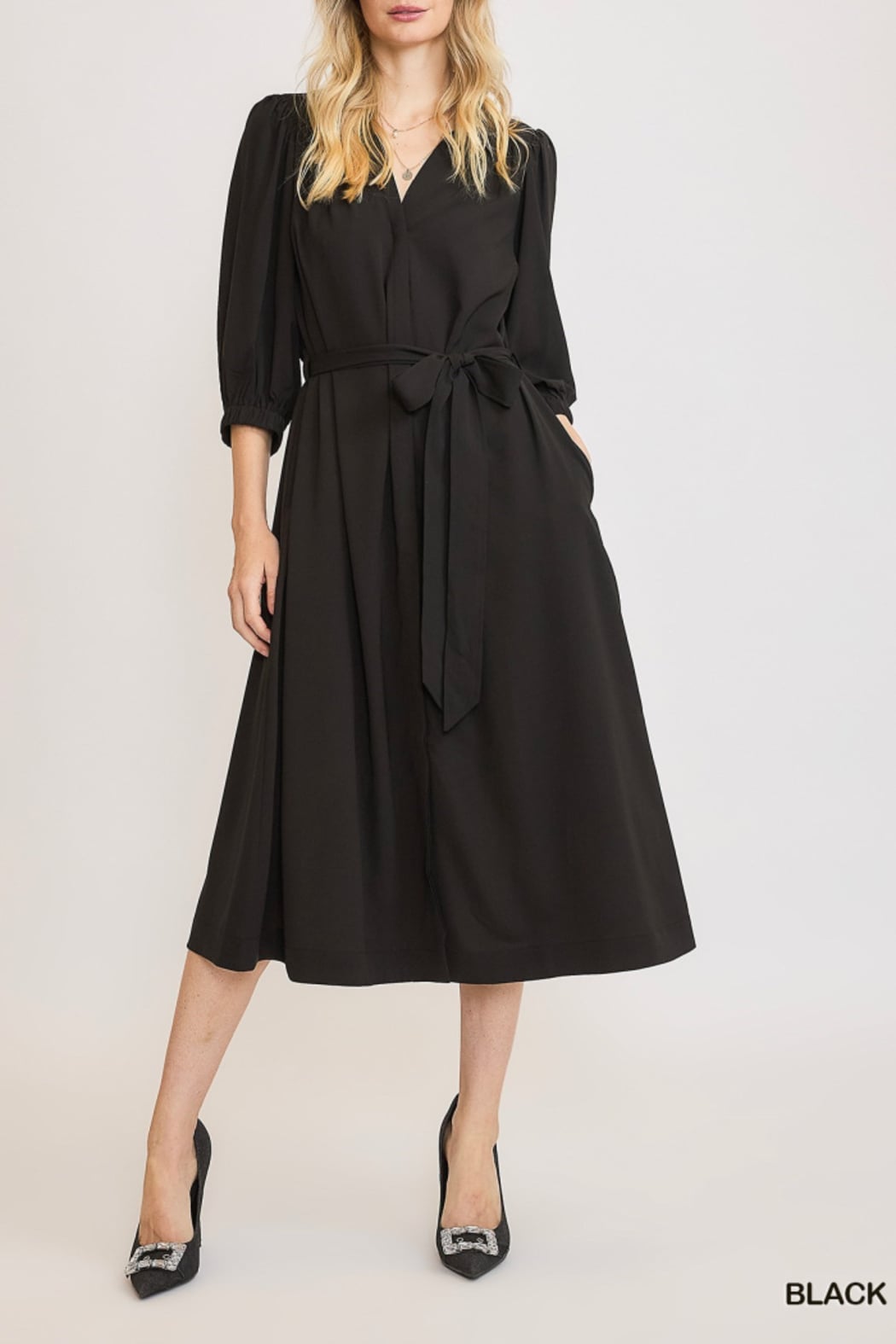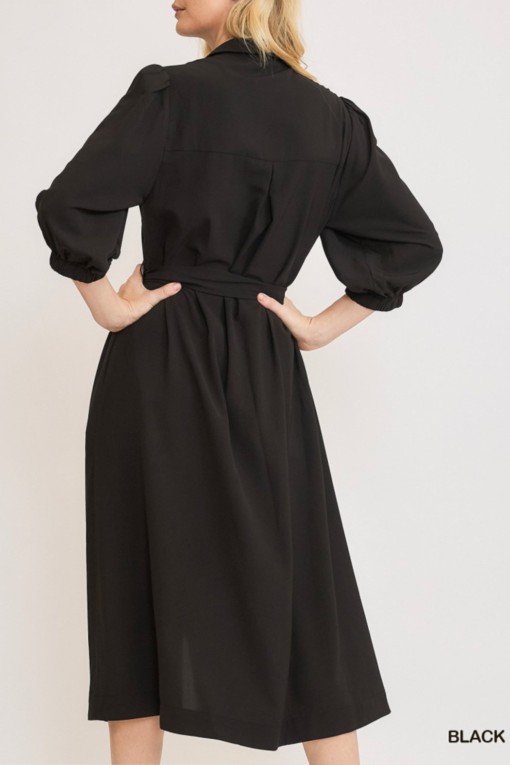 Beautiful solid black dress with v-neckline and shirt collar. Button front with straight hem and elastic band 3/4 length sleeve. Tie belt and side pockets. Model is wearing a size small. Refer to measurements for your perfect fit. Small: 19" across chest, 45.5" shoulder to hem Medium: 20" across chest, 45.75" shoulder to hem Large: 21" across chest, 46" shoulder to hem 100% Polyester