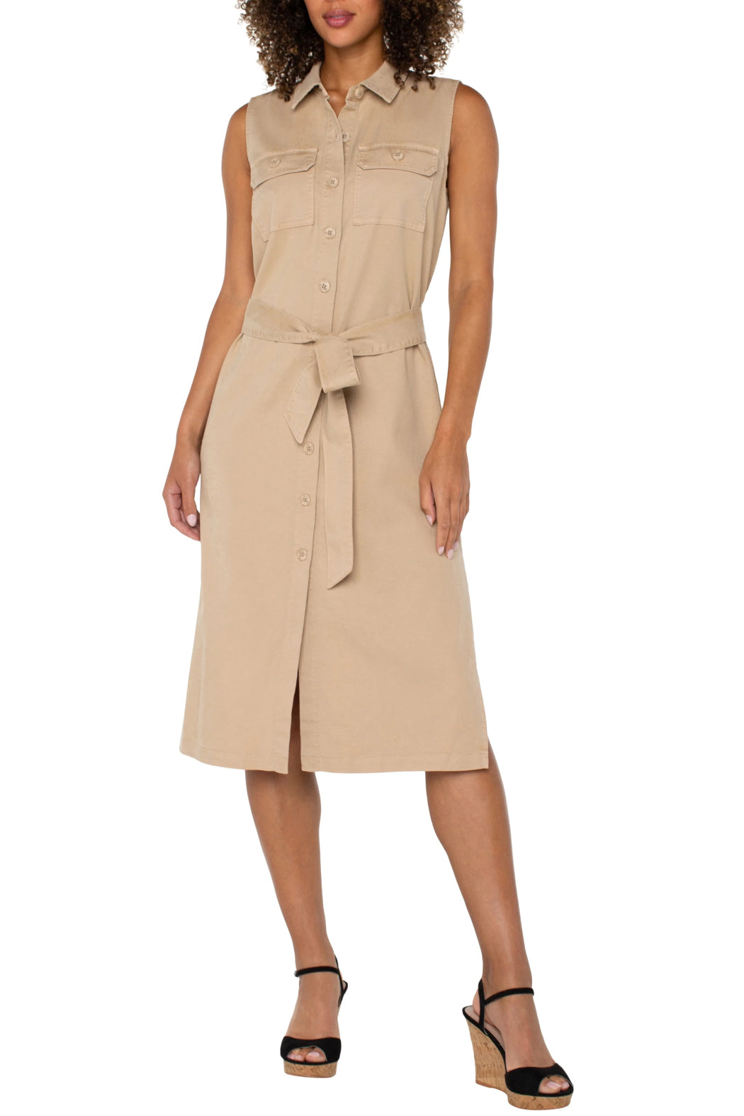Elegant sleeveless shirt dress with slits, classic collar, button-down front, and adjustable matching belt for a modern, flattering fit. This versatile dress can be dressed up with heels or kept casual with sandals, making it a go-to piece for both workdays and weekends.