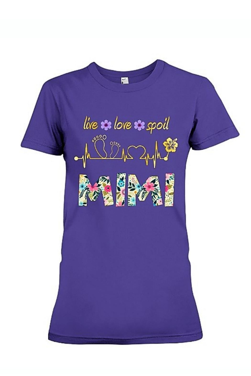 This is a Next Level brand "Live Love Spoil" T-shirt for you if you are lucky enough to be called Mimi by someone special (or if you know someone who is!) Premium fit Ladies Tee. Soft signature 100% preshrunk cotton. Rib-knit set-in collar. Deep Purple Rush shirt with colorful screen printing. Soft satin inside neck label. Graphic is printed in the U.S.A. Machine wash cold, non chlorine bleach only when needed, tumble dry low, do not iron screen printing.