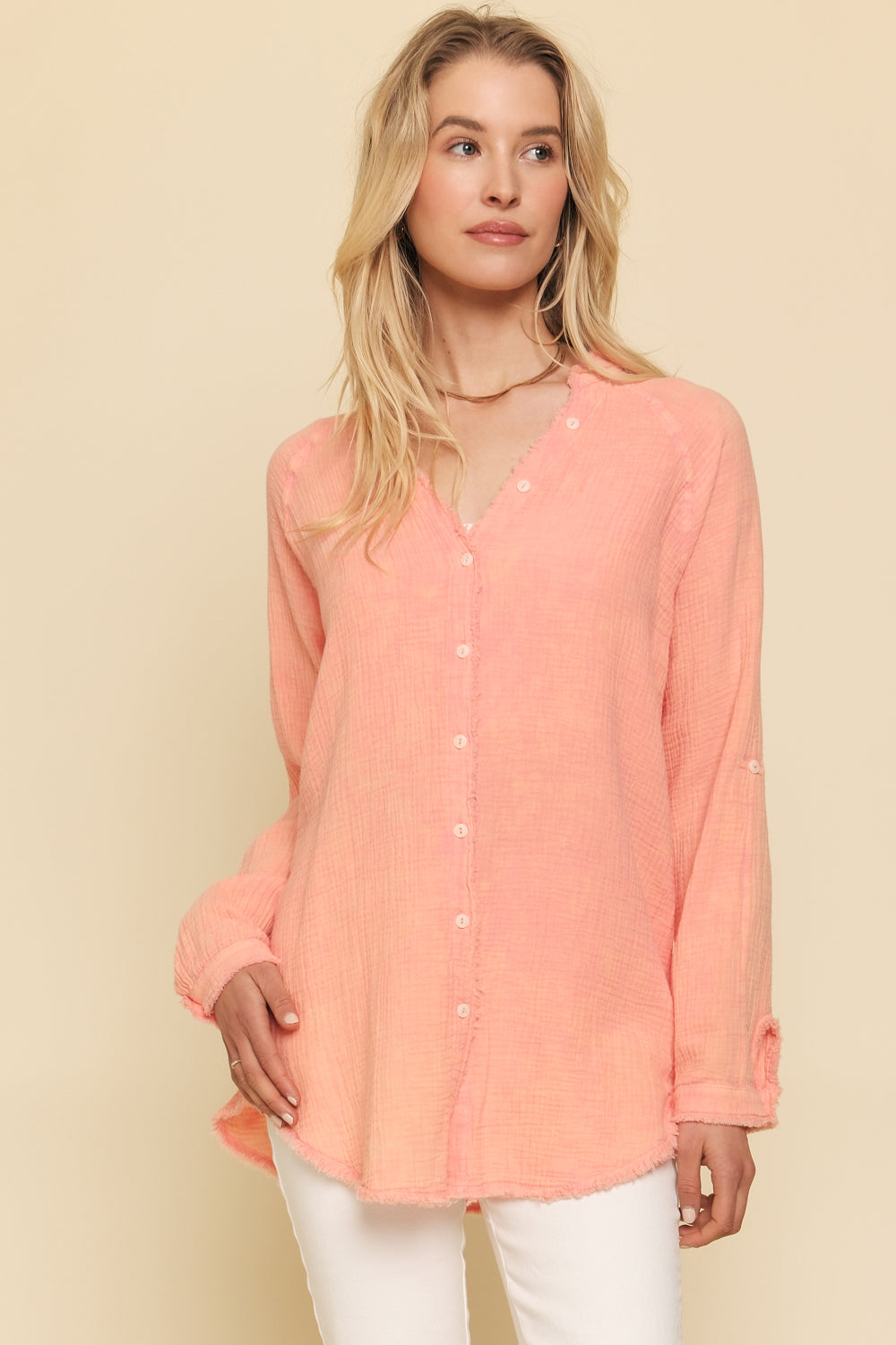 Long Sleeve Frayed Edge Button Up Mineral washed Coral with flecks of yellow Top. Model is wearing a size small