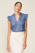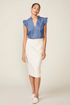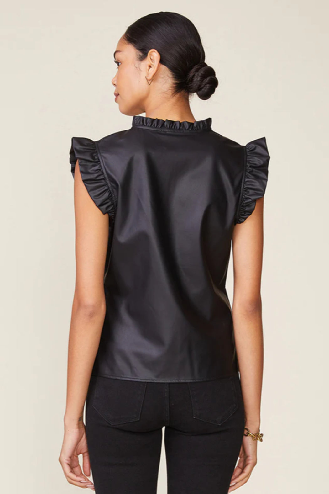 Make a bold statement with this vegan leather V-neck top, an ANTHEM classic that blends edgy sophistication with feminine charm. Featuring a chic ruffled collar and flutter sleeves, it’s a standout piece designed to turn heads. Perfectly paired with the Morrison Vegan Leather Seam Midi Skirt, this top creates a sleek, coordinated look that’s effortlessly polished.