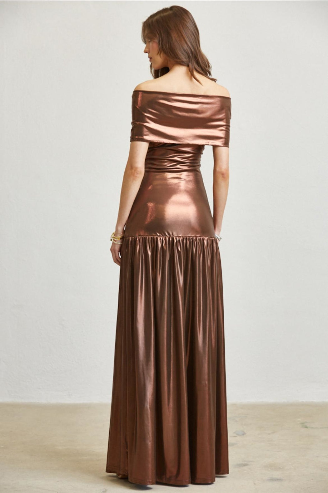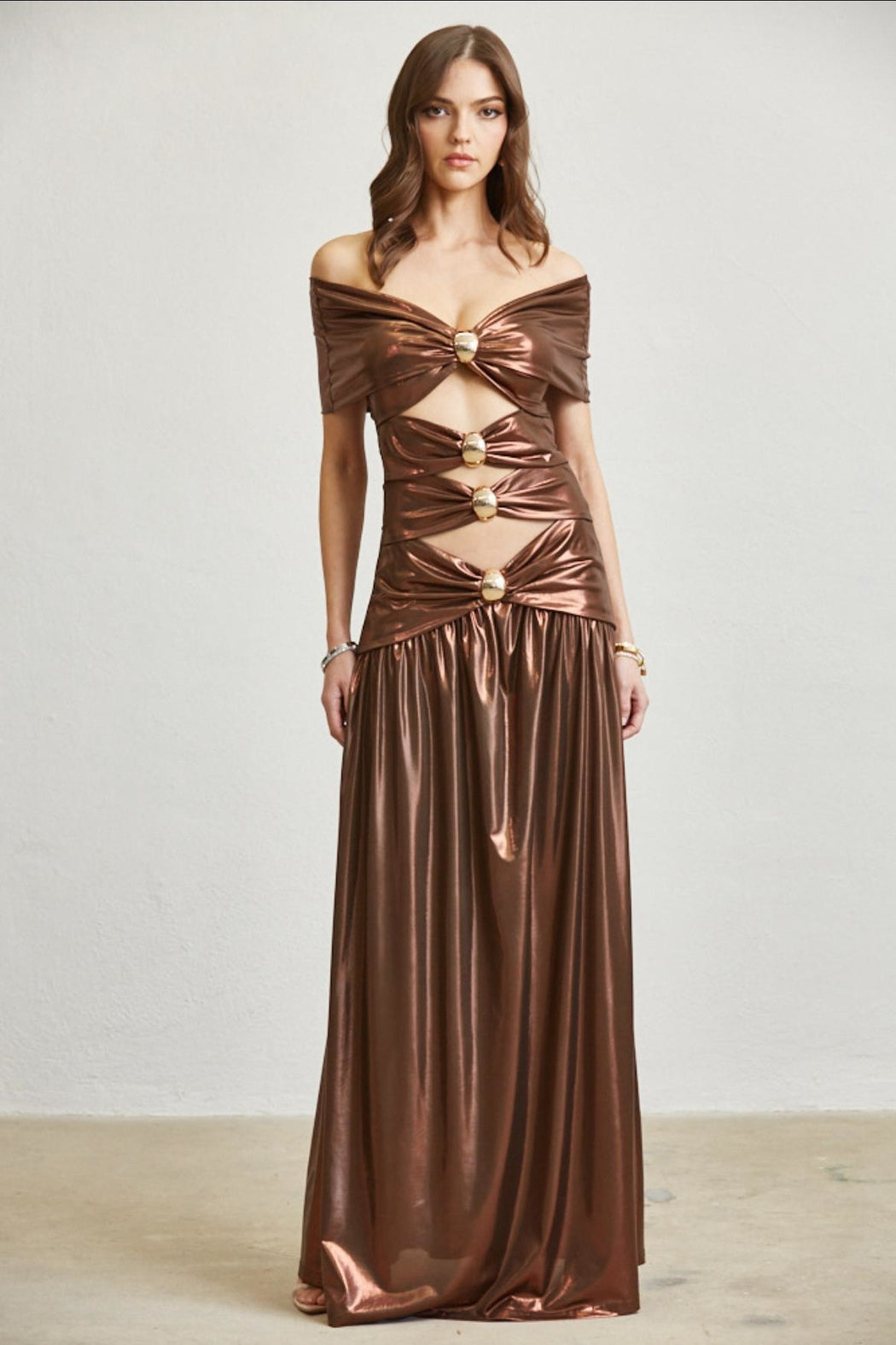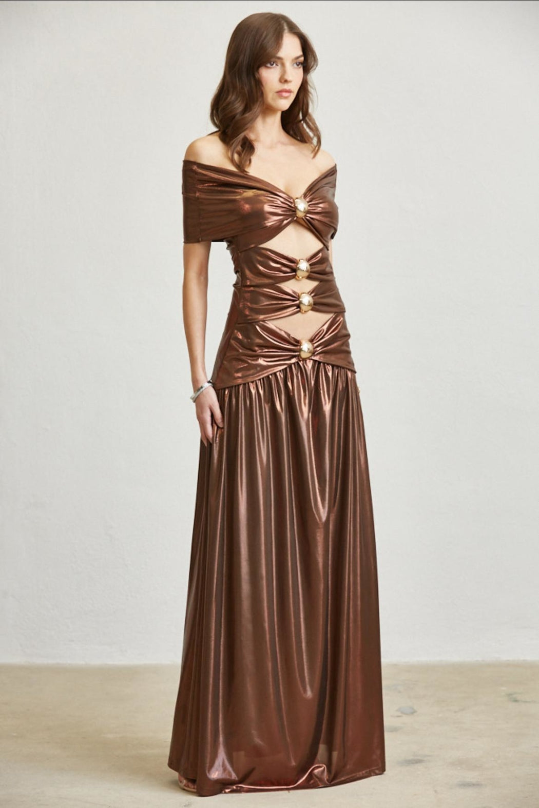 Off shoulder cut out metallic maxi dress. Model is wearing a size Small