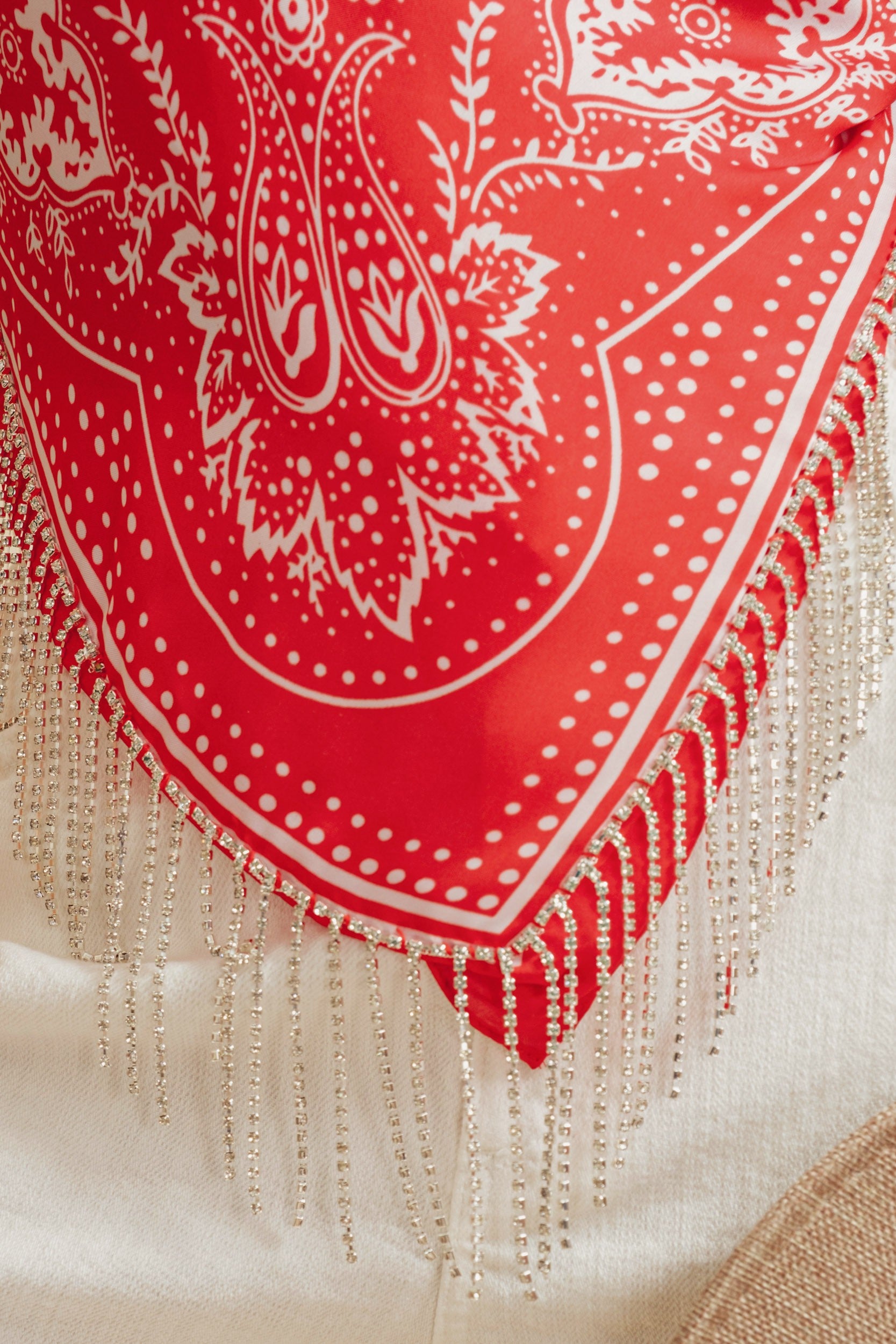 PAISLEY BORDER PRINT RHINESTONE TRIM SCARF TOP. ONE SIZE. Made in China.