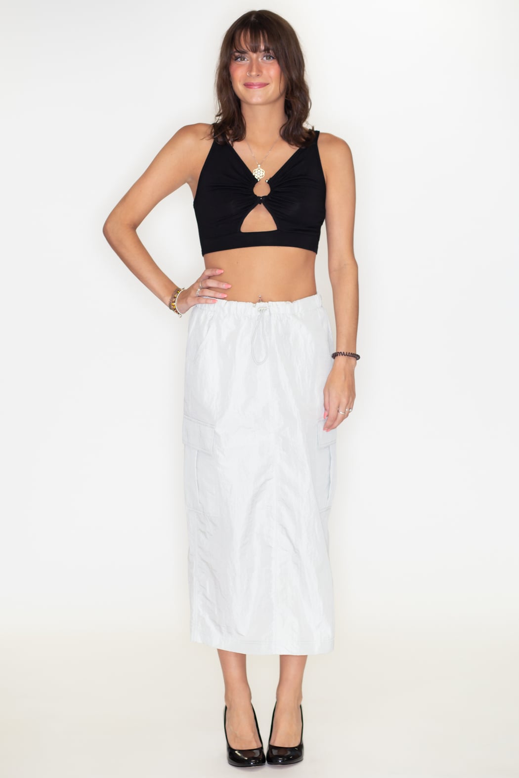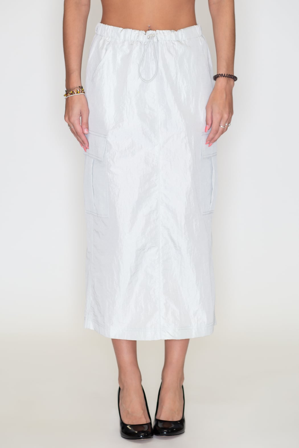 Take your style game up a notch with this midi skirt! Featuring a drawstring waist and a flattering fit, we are in love with this versatile piece that can be styled in various ways. Side cargo pockets and a back slit are the finishing touches.