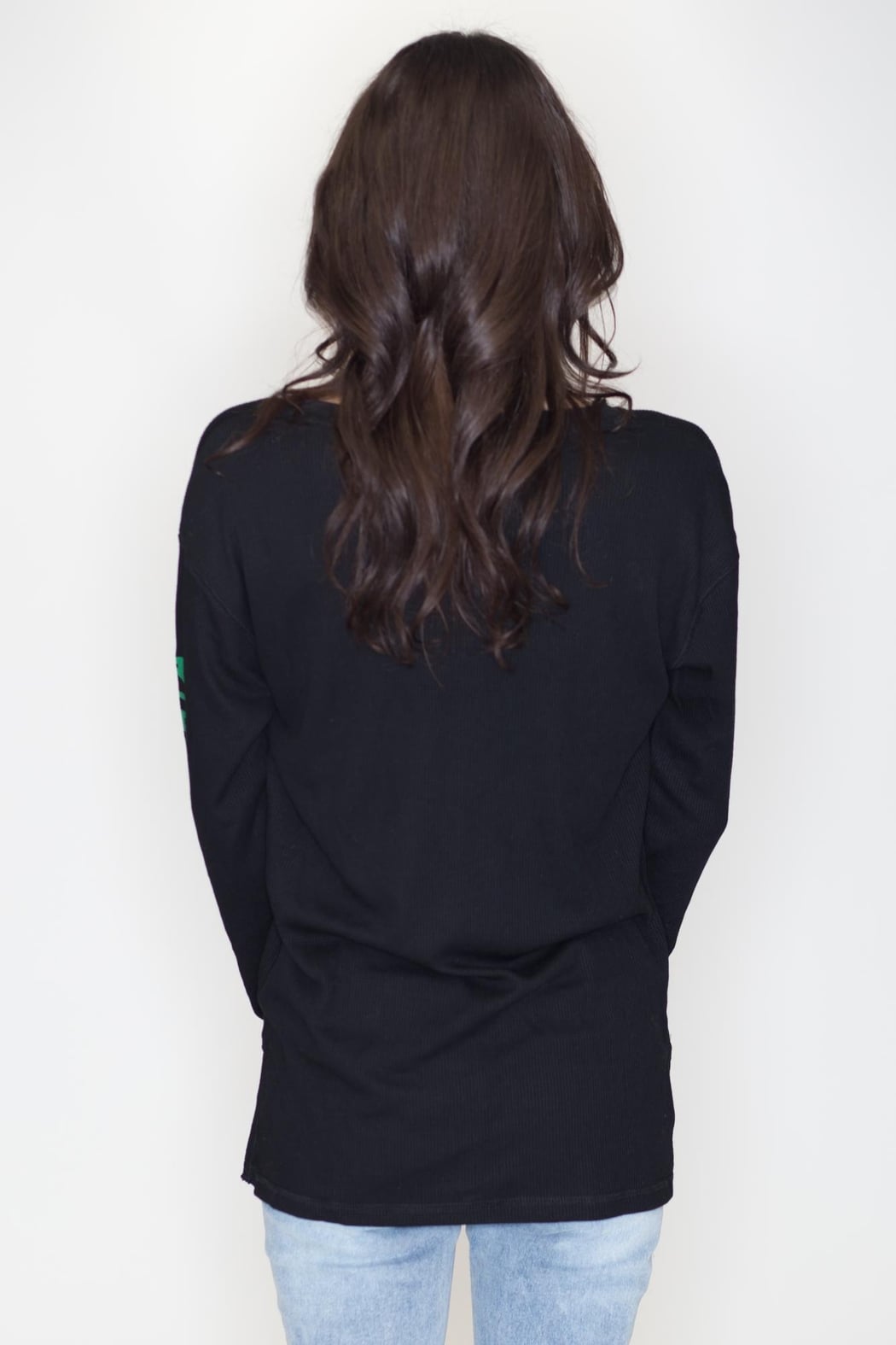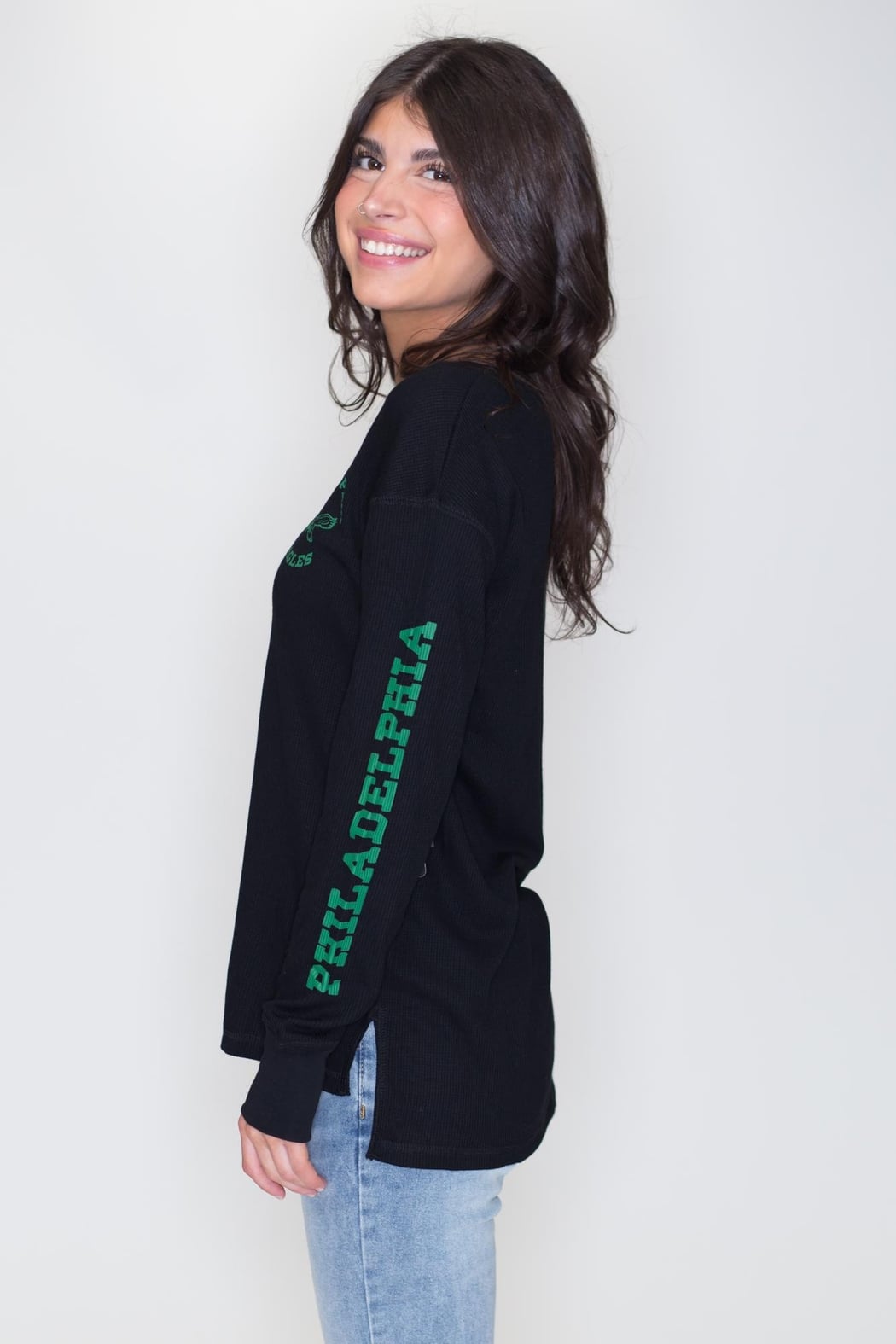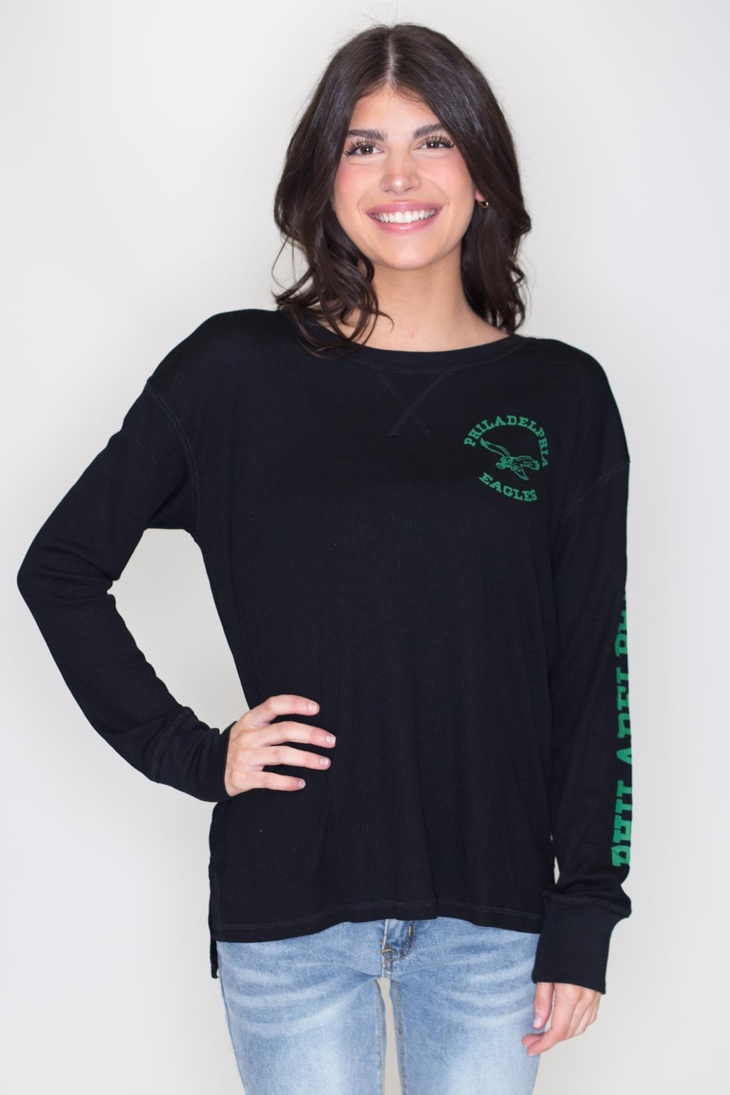 Philadelphia Eagles black thermal long sleeve tee with chest logo and Philadelphia print down the sleeve.