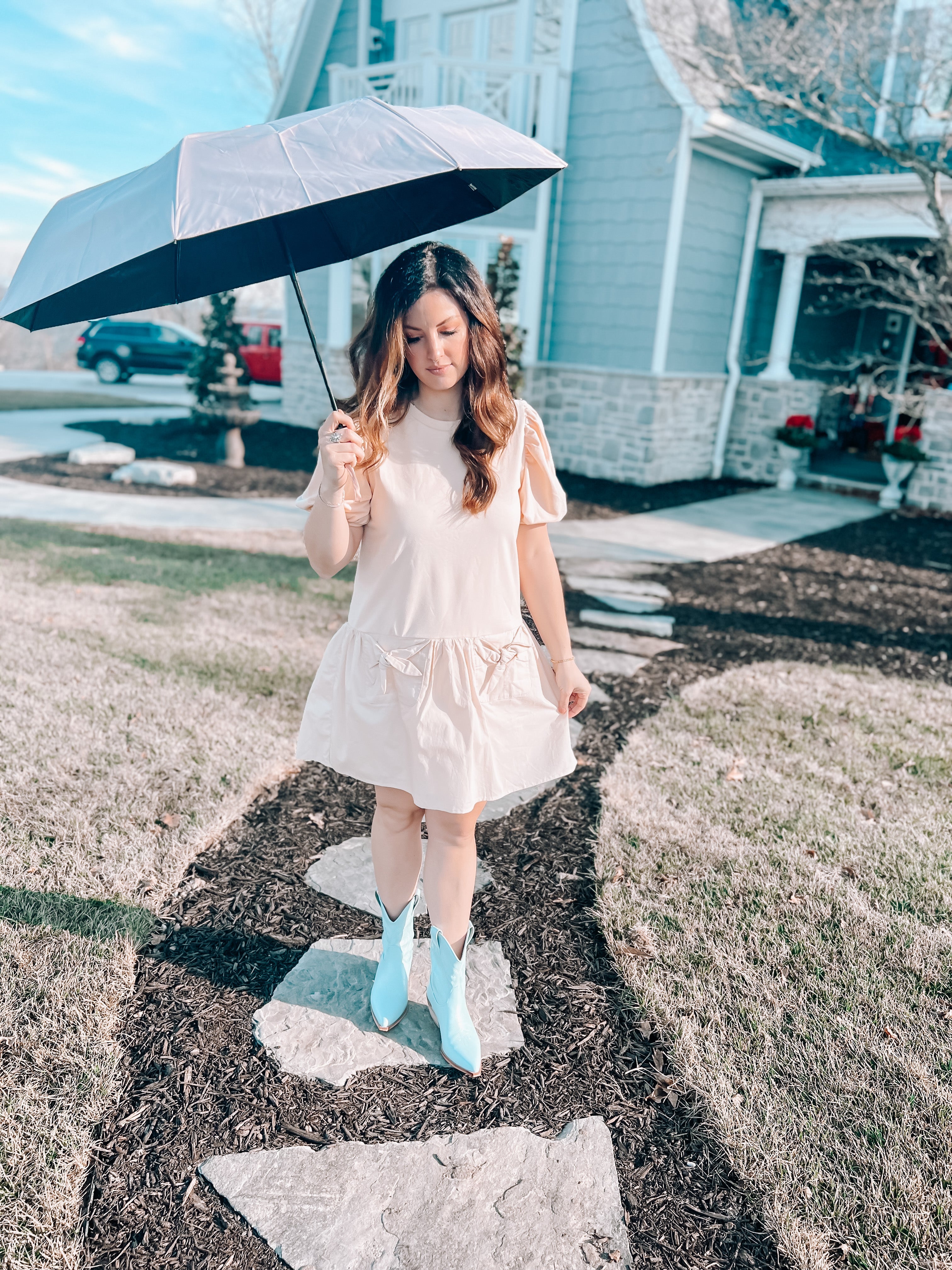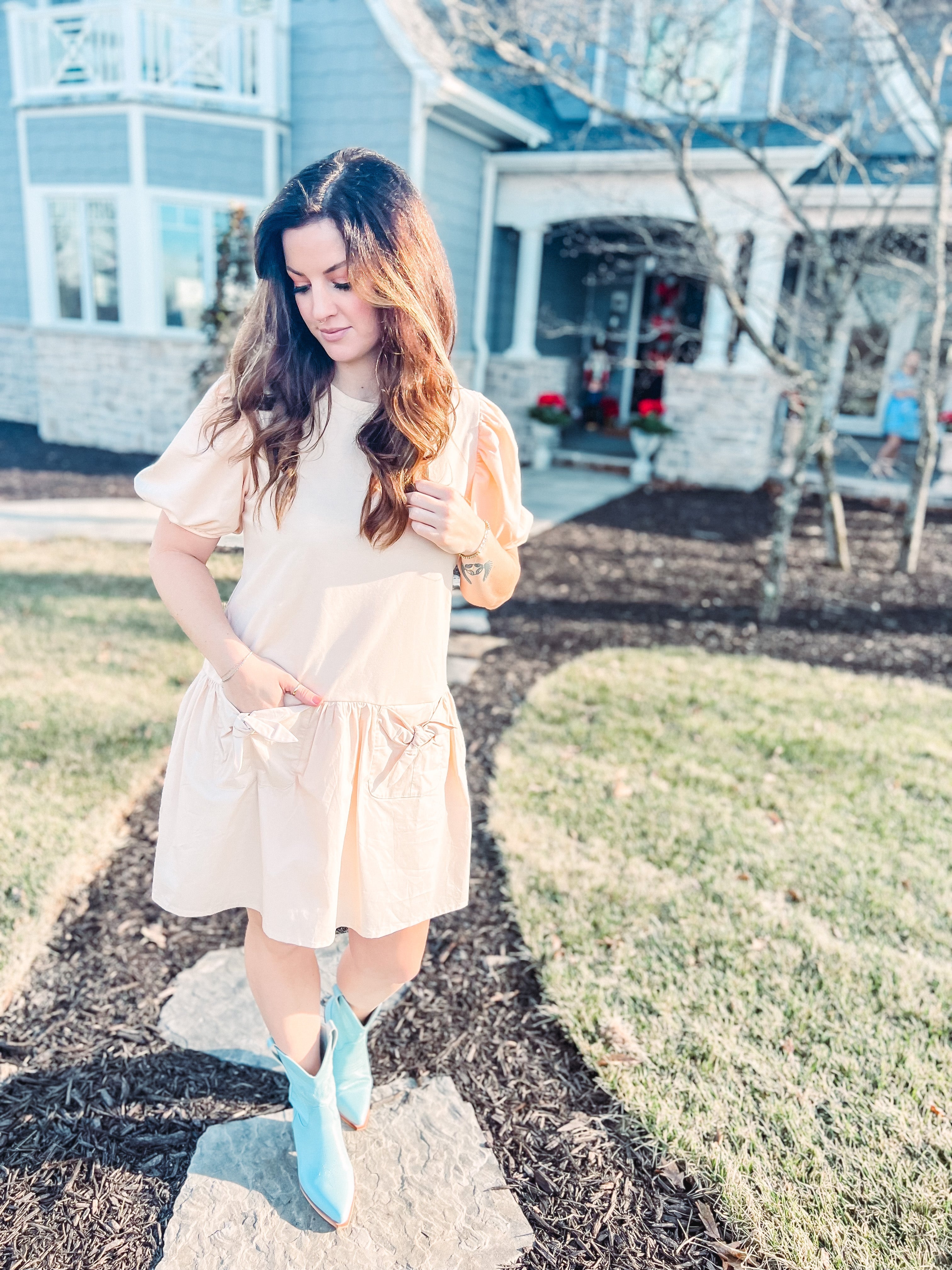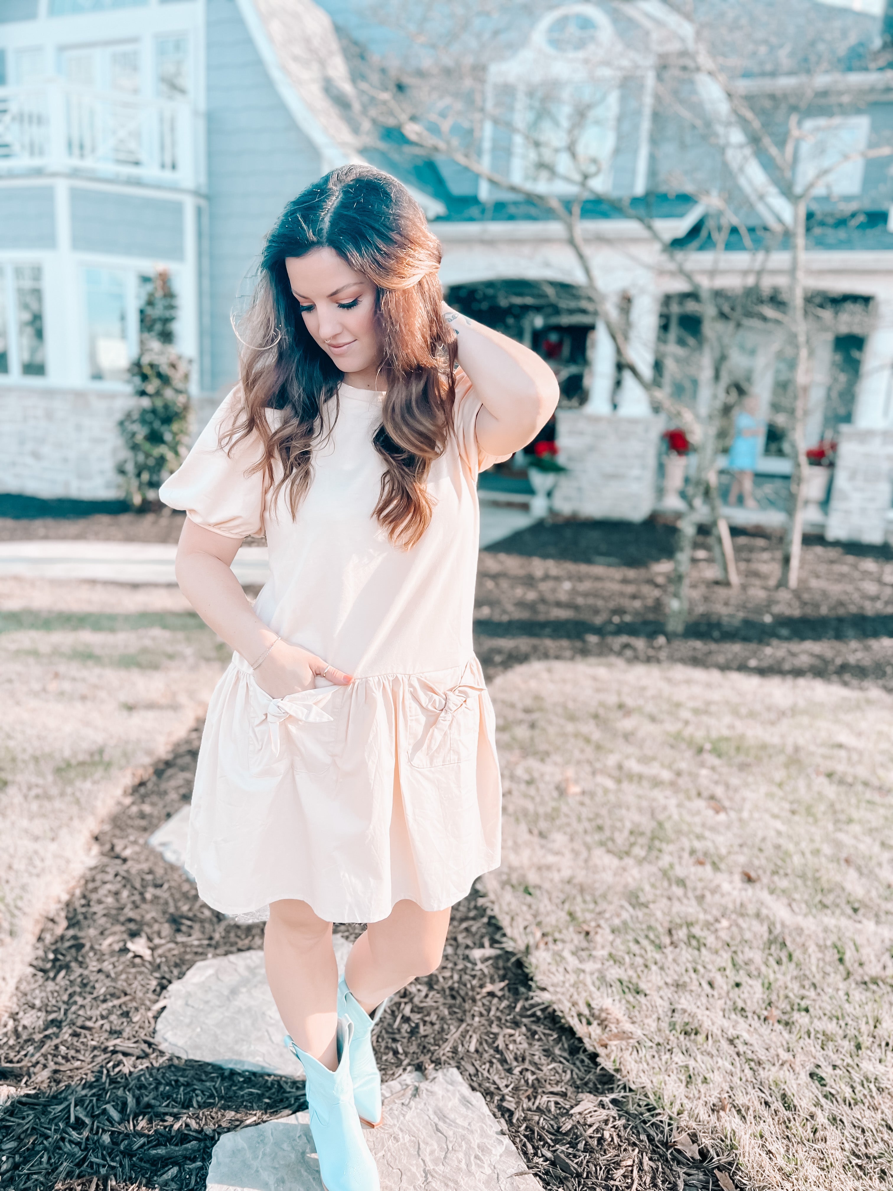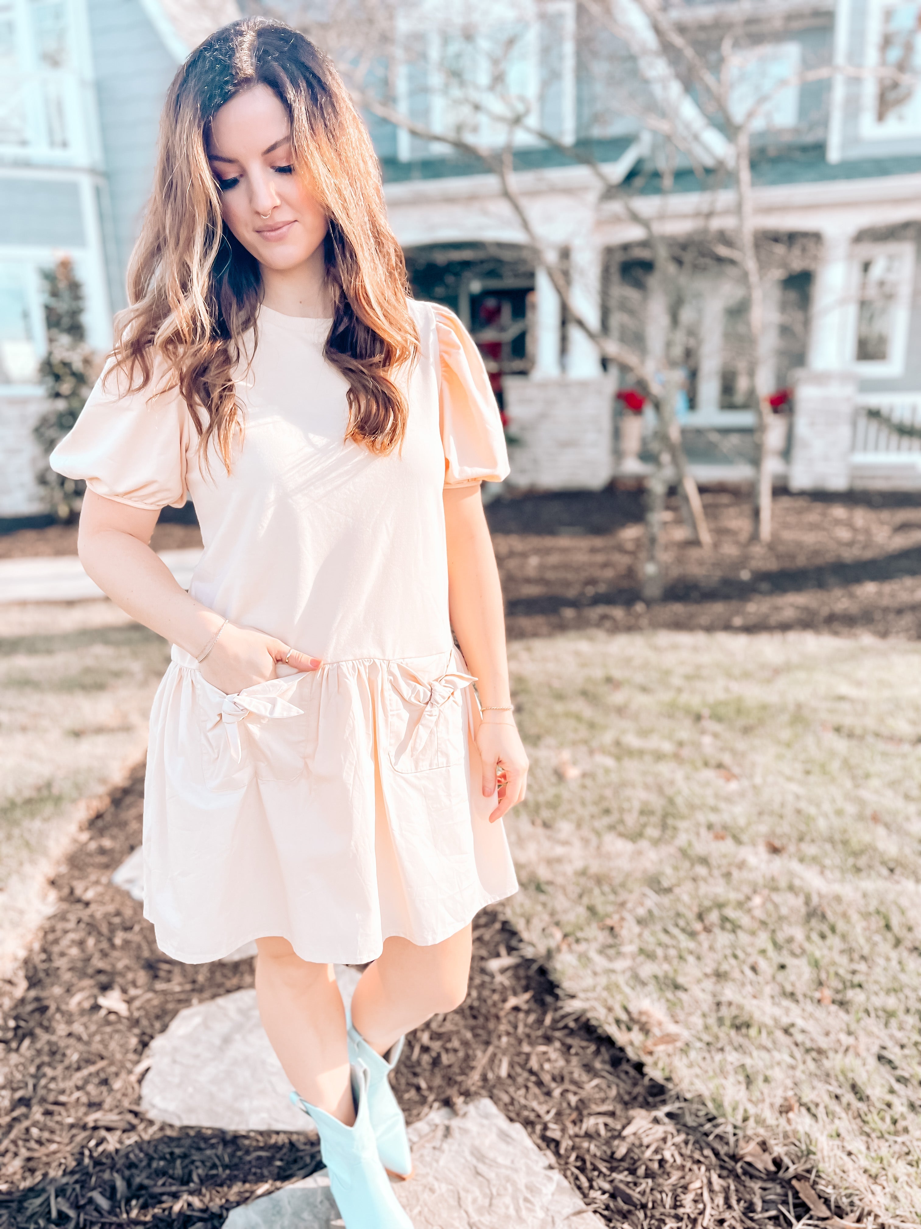 Description: Cream colored, short puff sleeve dress, drop waist, poplin skirt, bow front pockets