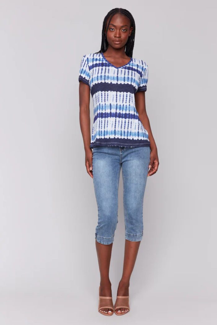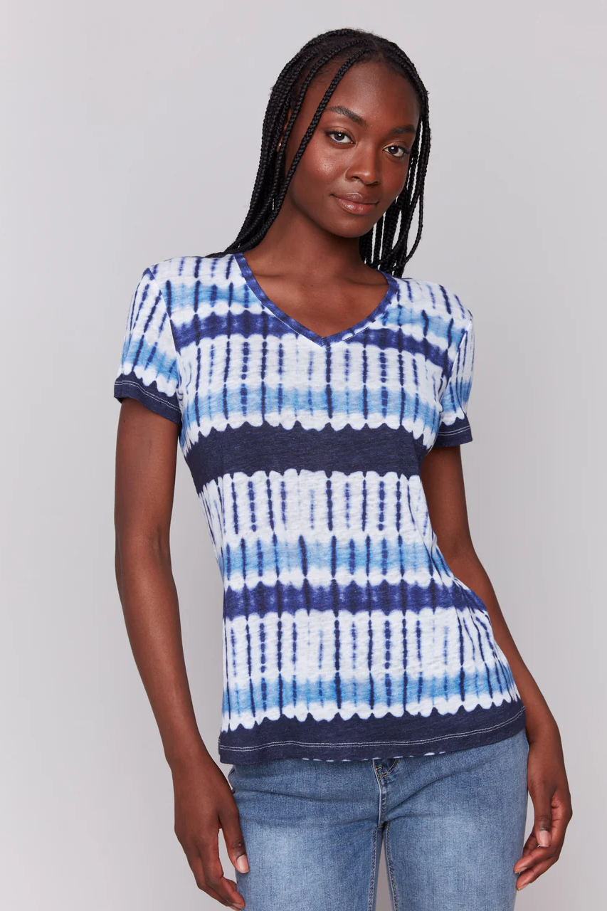 Refresh your spring wardrobe with our linen blend striped V-neck T-shirt in a lilypad shade that enhances your fashion flair. Featuring a graceful v-neckline and multicolored stripes, both versatile and fashionable, it's an indispensable choice for those looking to effortlessly elevate their style game.