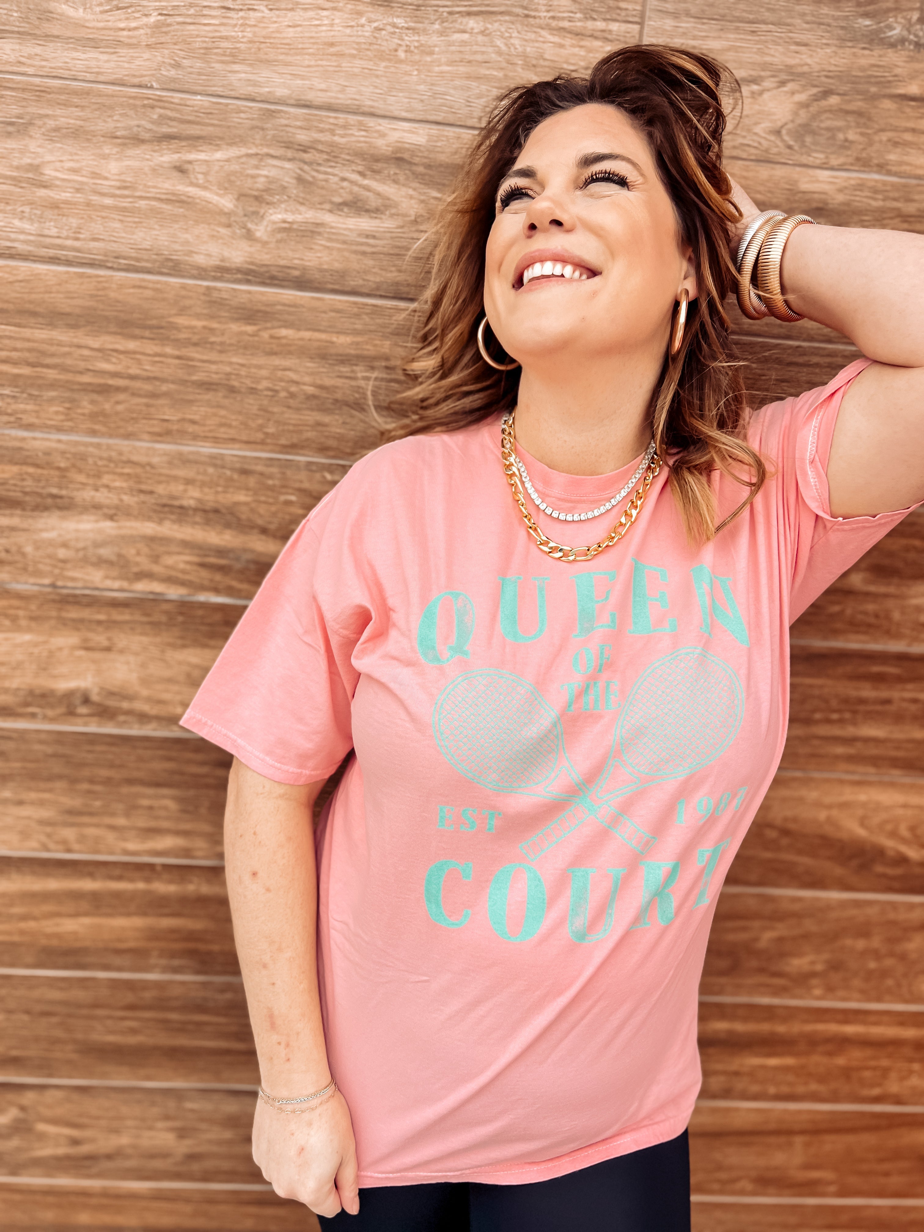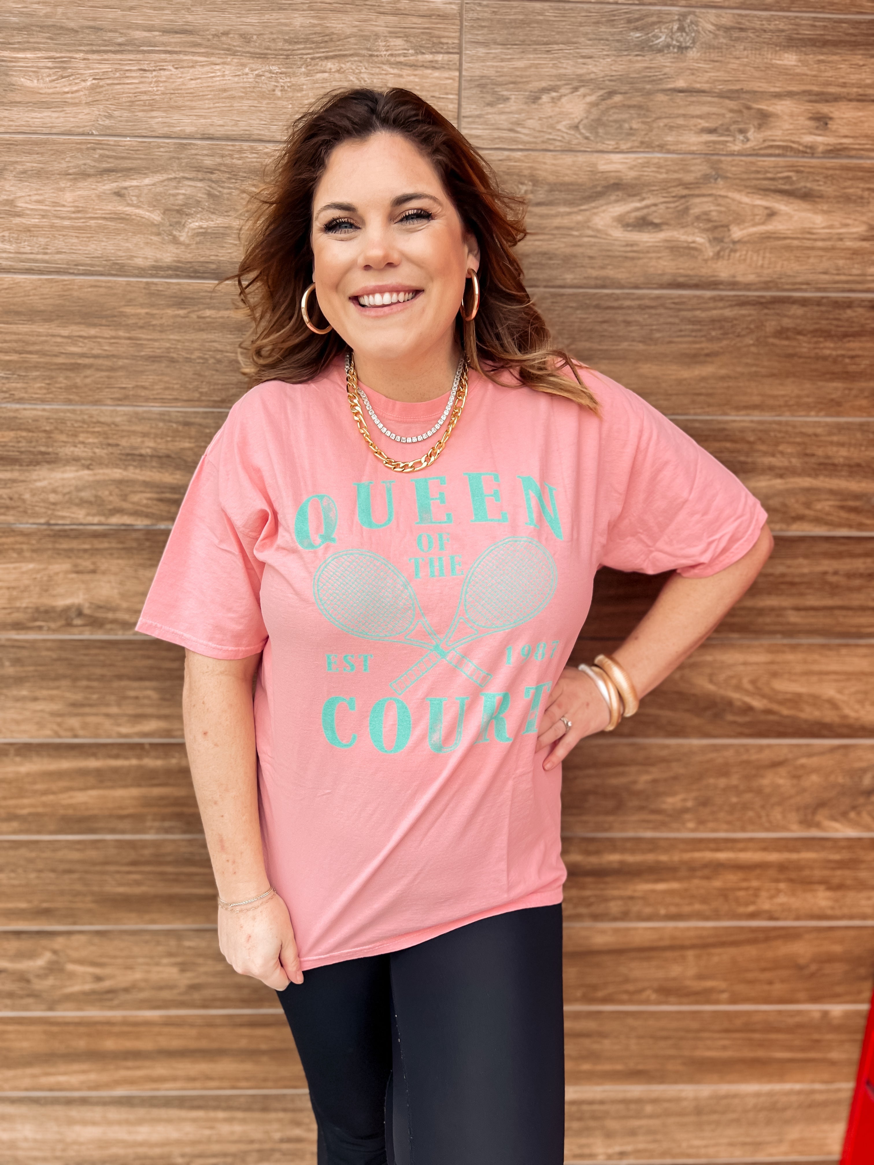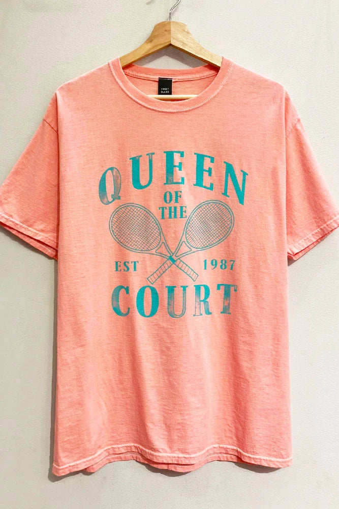 The Queen of the Court Graphic Tee combines trendiness and comfort with its oversized fit and bold graphic design. Show off your court dominance in style.