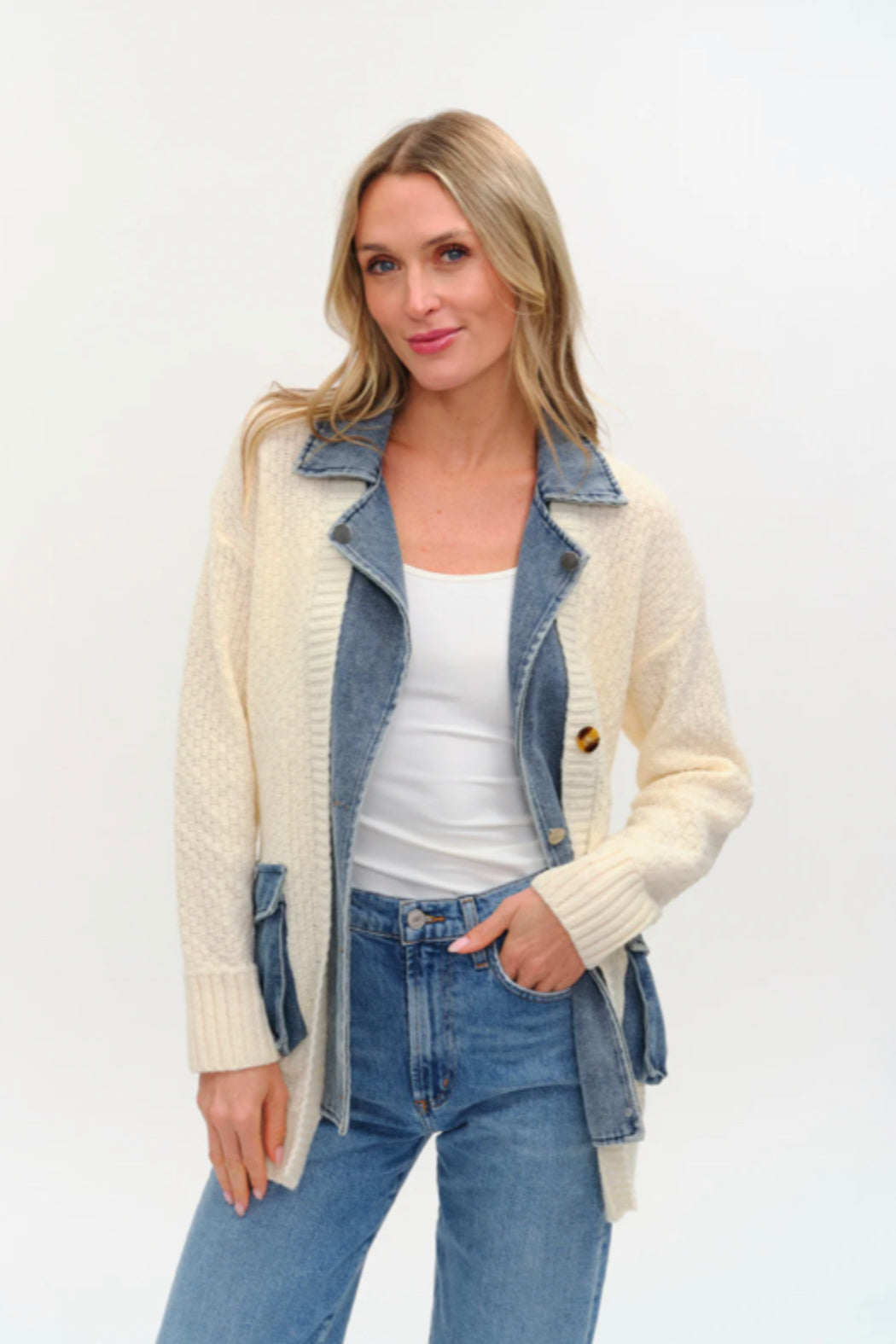 The Rachel Cardigan playfully layers soft, cozy knit with a denim material underneath for a stylish surprise. This unique combo adds texture and edge to your look while keeping you comfy and ready for anything. Perfect for those who love a little twist in their wardrobe!