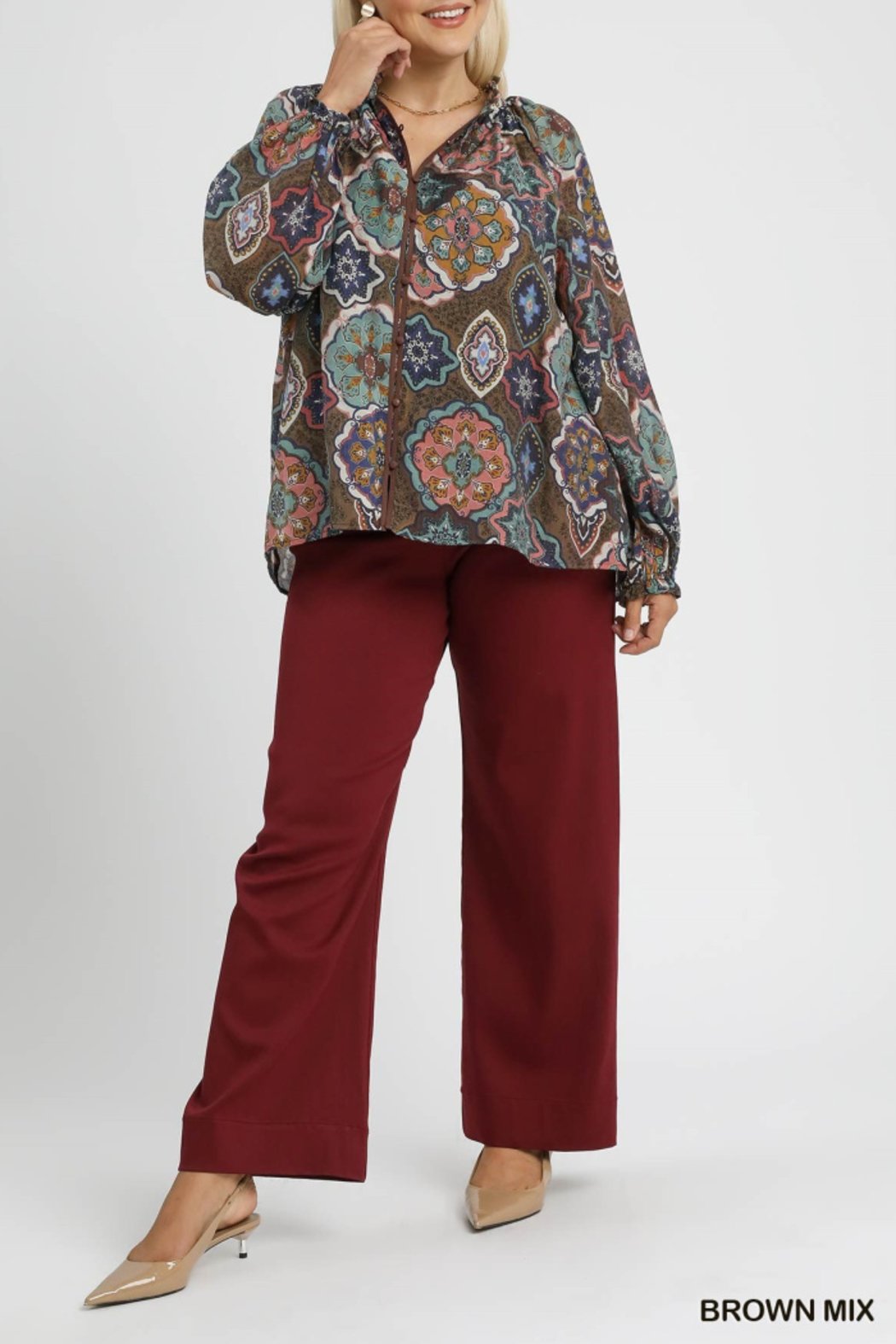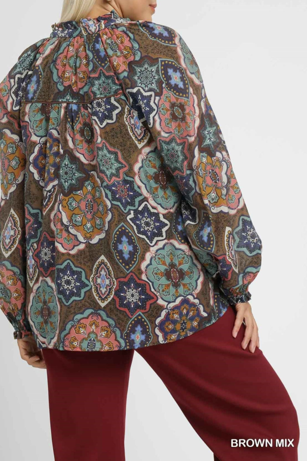 Medallion print top with long sleeve and round collar with buttons. Refer to measurements for your perfect fit.