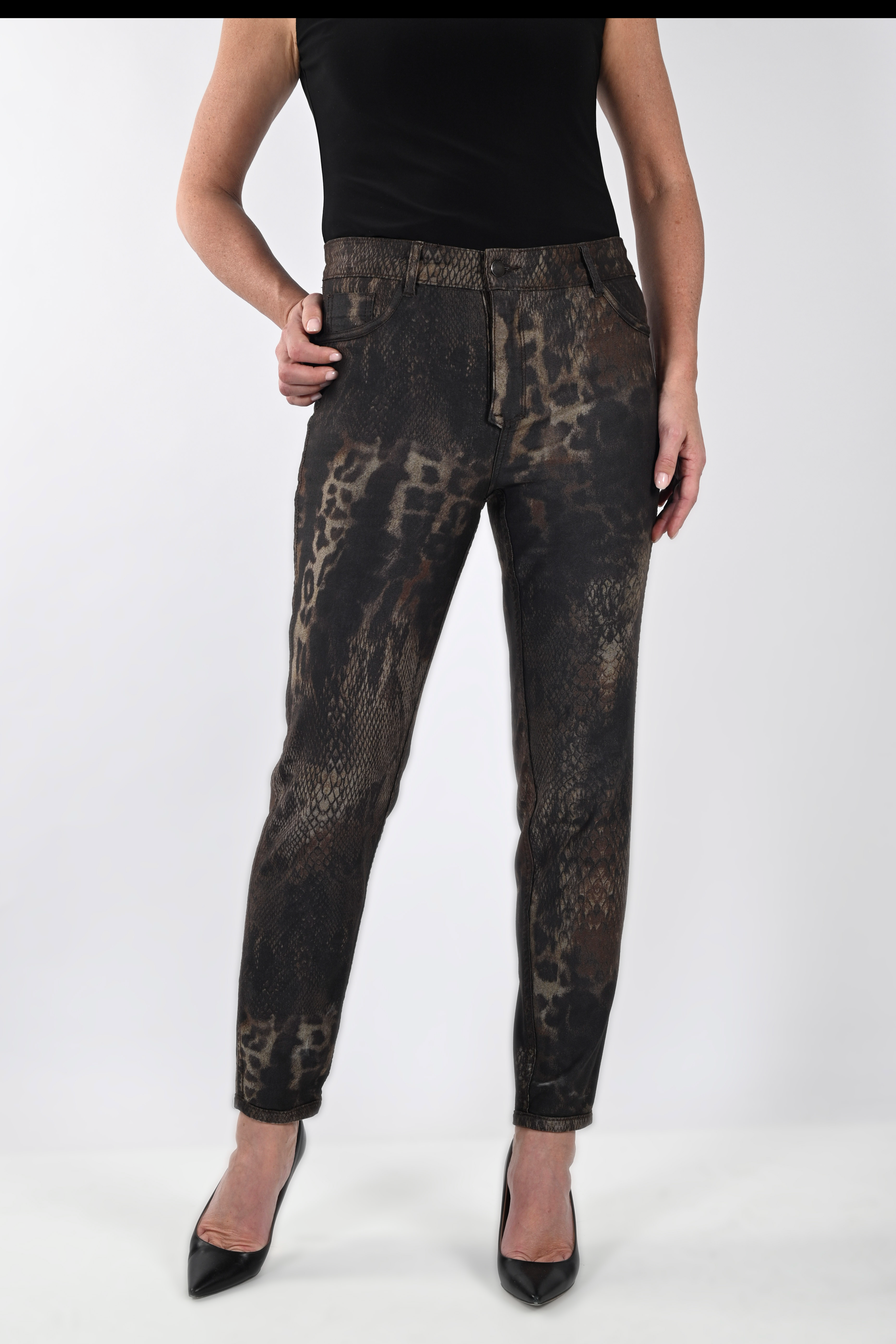 2 in 1 Reversible jean in floral-black. Fly front with belt loops. Hand wash cold water inside out hang to dry, 65% cotton-33% polyester-2% elasthane. Unlined with an approx. 10 inch rise and 28 inch inseam. Sized XS-XXL. MSF.