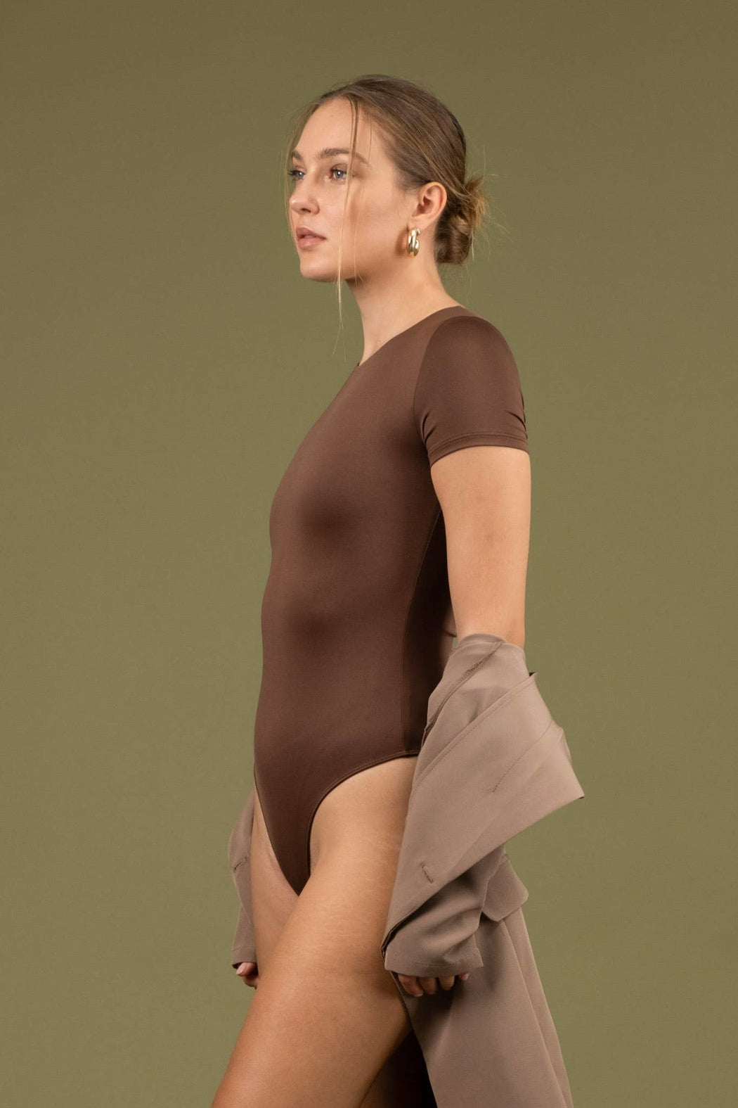 A sleek round-neck, short-sleeve bodysuit with a smooth, form-fitting silhouette. The Round Neck Short Sleeve Bodysuit is crafted to sit close to the body for a streamlined layered look. This piece is styled by The Workshop and works well for everyday casual wear or dressed-up ensembles.
