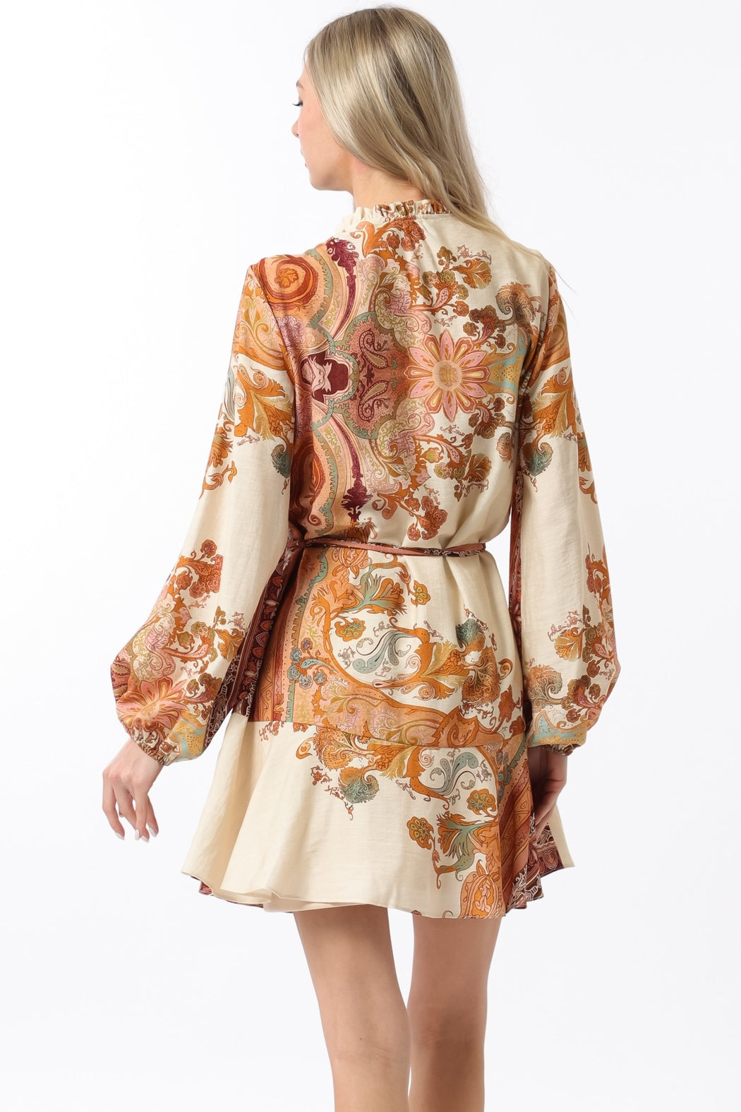 The Ruffle Neck Print Mini Dress features a plunging vee ruffle neckline, long full sleeves with an elastic cuff, tie belt at the waist, and a ruffle hem.