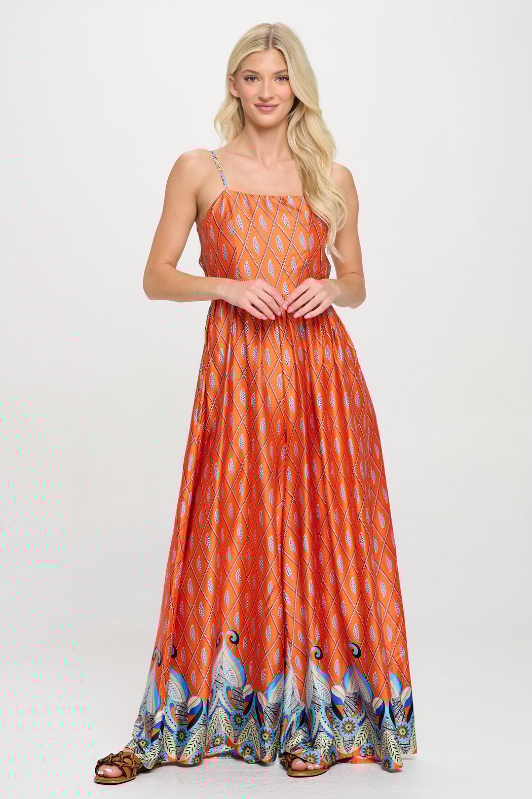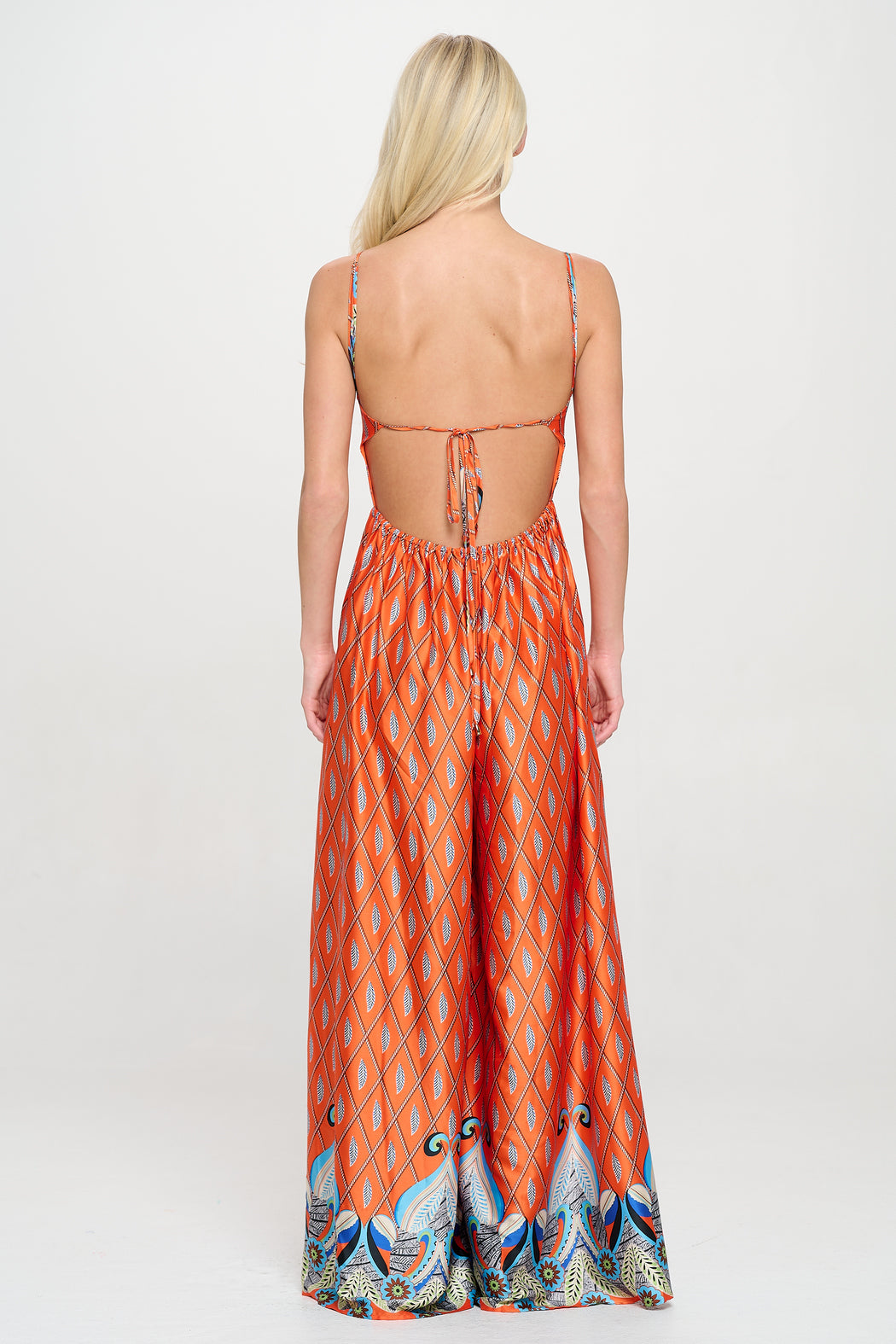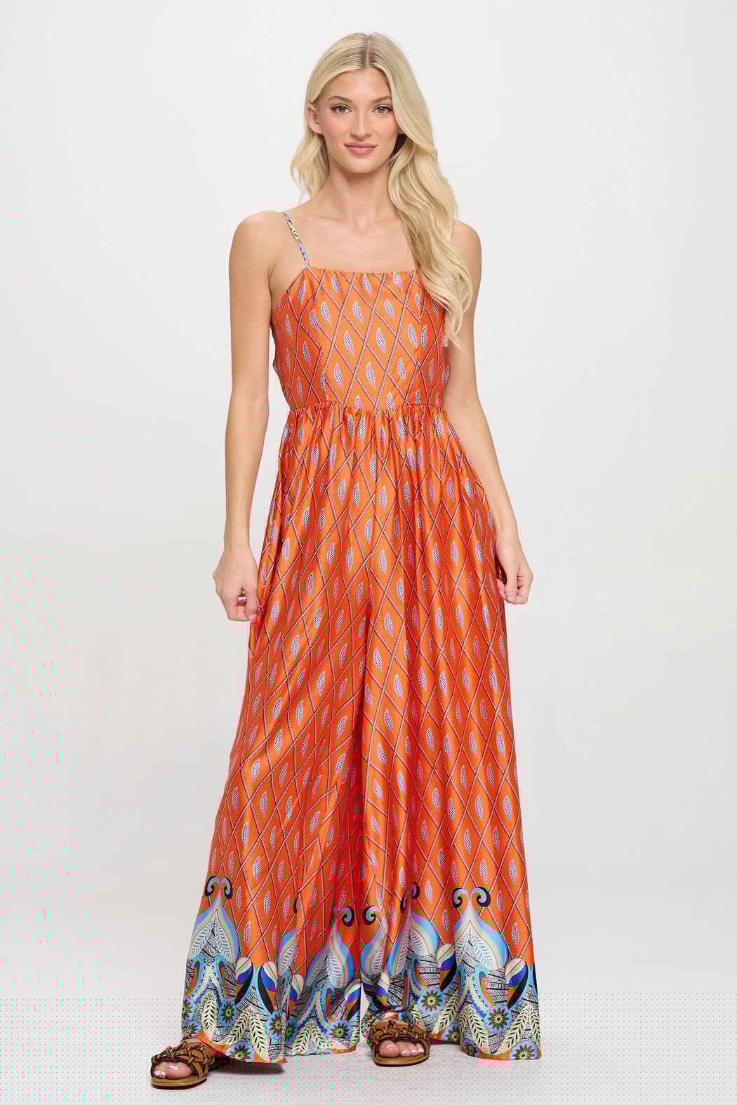 The Saffron Paralia Jumpsuit brings drama and ease together in one fluid silhouette. Perfect for balmy evenings, island escapes, and effortless elegance. Crafted in a silky, lightweight fabric with a bold saffron-hued mosaic print, this wide-leg jumpsuit features a soft square neckline, adjustable spaghetti straps, and a gathered waist for flattering definition. The breezy, full-length pants creates the illusion of a maxi dress, offering comfort and movement for vacation days that flow into dreamy nights. Whether worn with flat sandals or elevated with heels, this women’s resortwear piece is a standout from coast to coast.