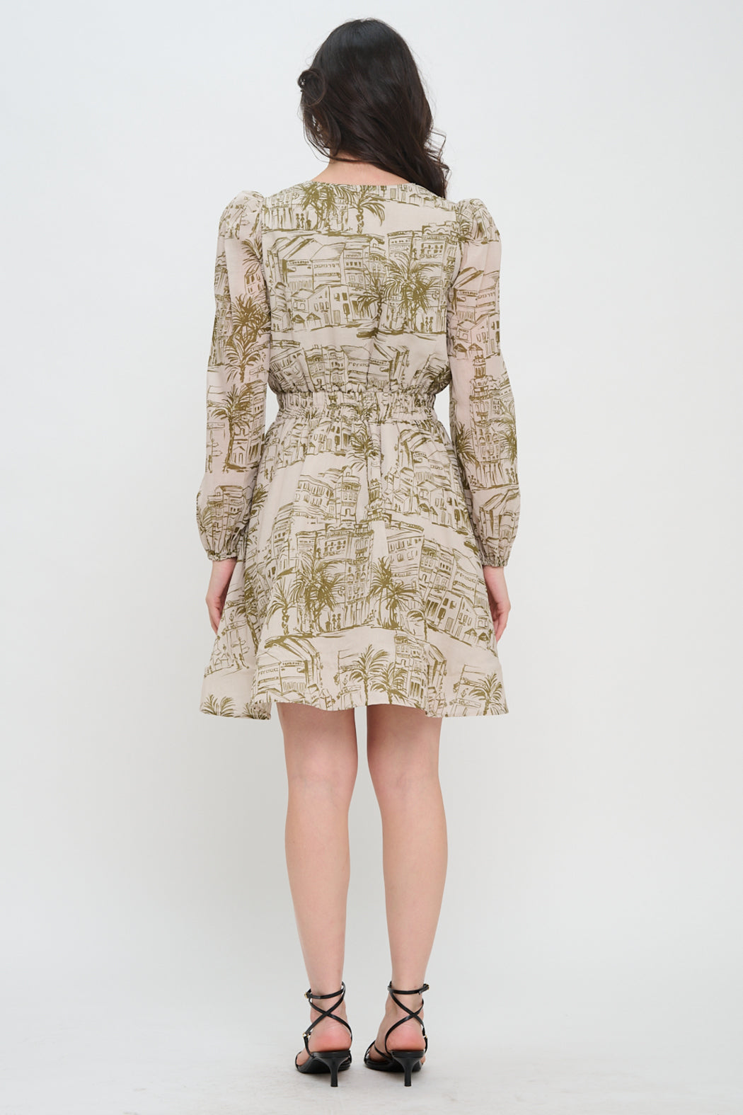Step into effortless elegance with the Santorini Olive Long Sleeve Short Dress, a romantic silhouette that captures the charm of a Grecian escape. Crafted from lightweight woven fabric, this dress showcases an enchanting olive-toned cityscape print, bringing the streets of Santorini to life. The plunging V-neckline and gathered elastic waist flatter the figure, while the long puff sleeves with elastic cuffs add a touch of soft volume. Perfect for brunch by the coast or sunset strolls, this piece pairs beautifully with strappy sandals or heeled mules. Whether worn for resort getaways or weekend gatherings, it’s a versatile style that blends comfort with chic sophistication.