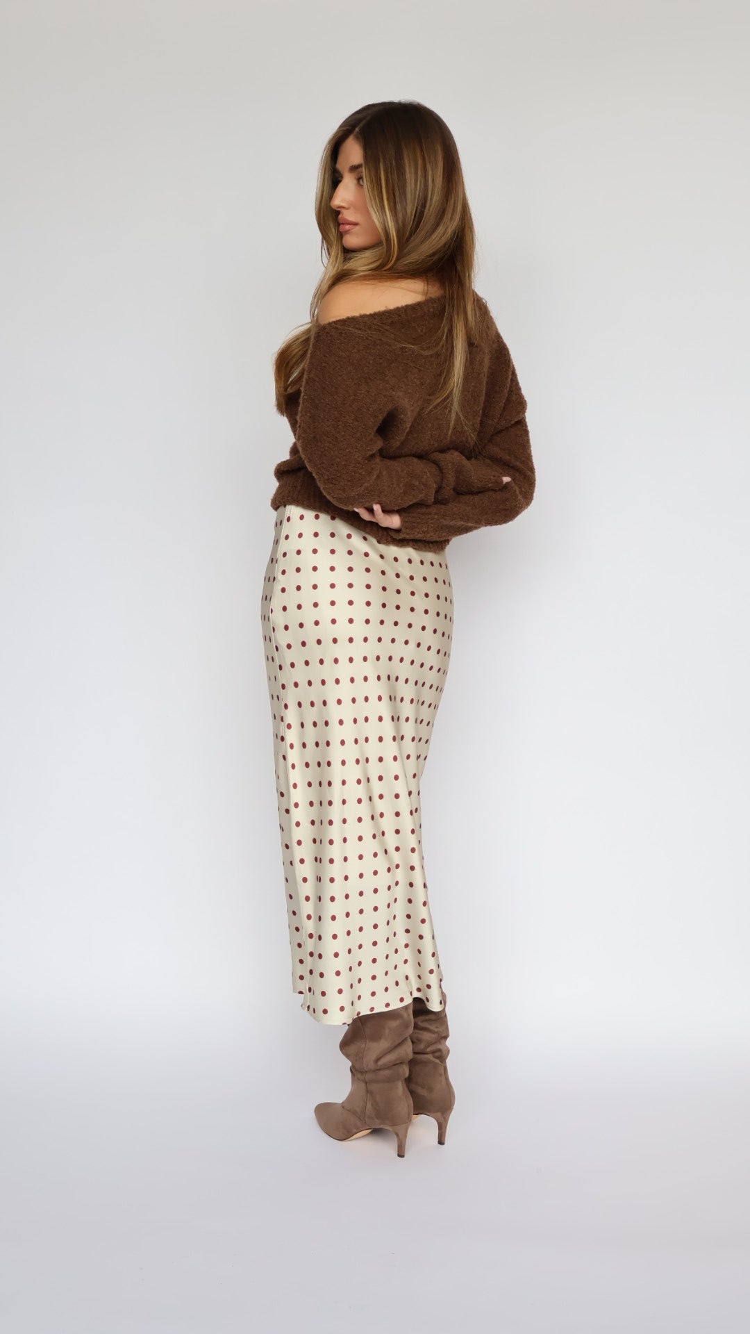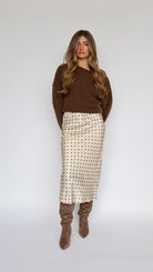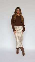 Meet your new favorite statement piece—the Ivory and Brown Polka Dot Satin Midi Skirt. Designed with a smooth, glossy satin finish and a classic polka-dot print, this skirt brings together vintage charm and modern elegance. Its flattering midi length and fluid drape create a graceful silhouette that moves beautifully with every step.