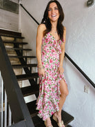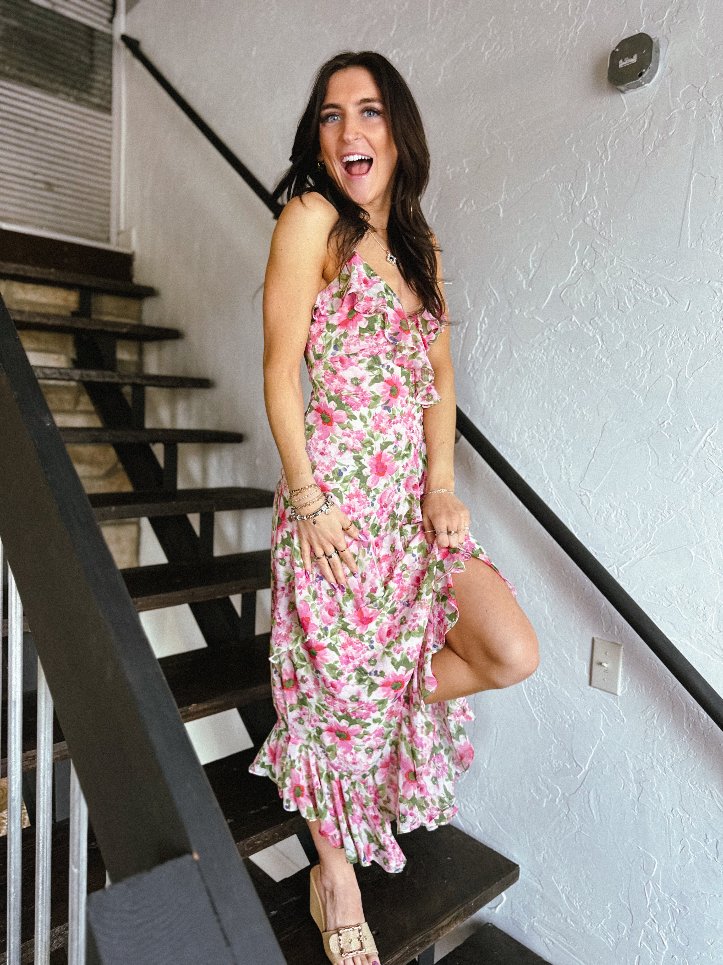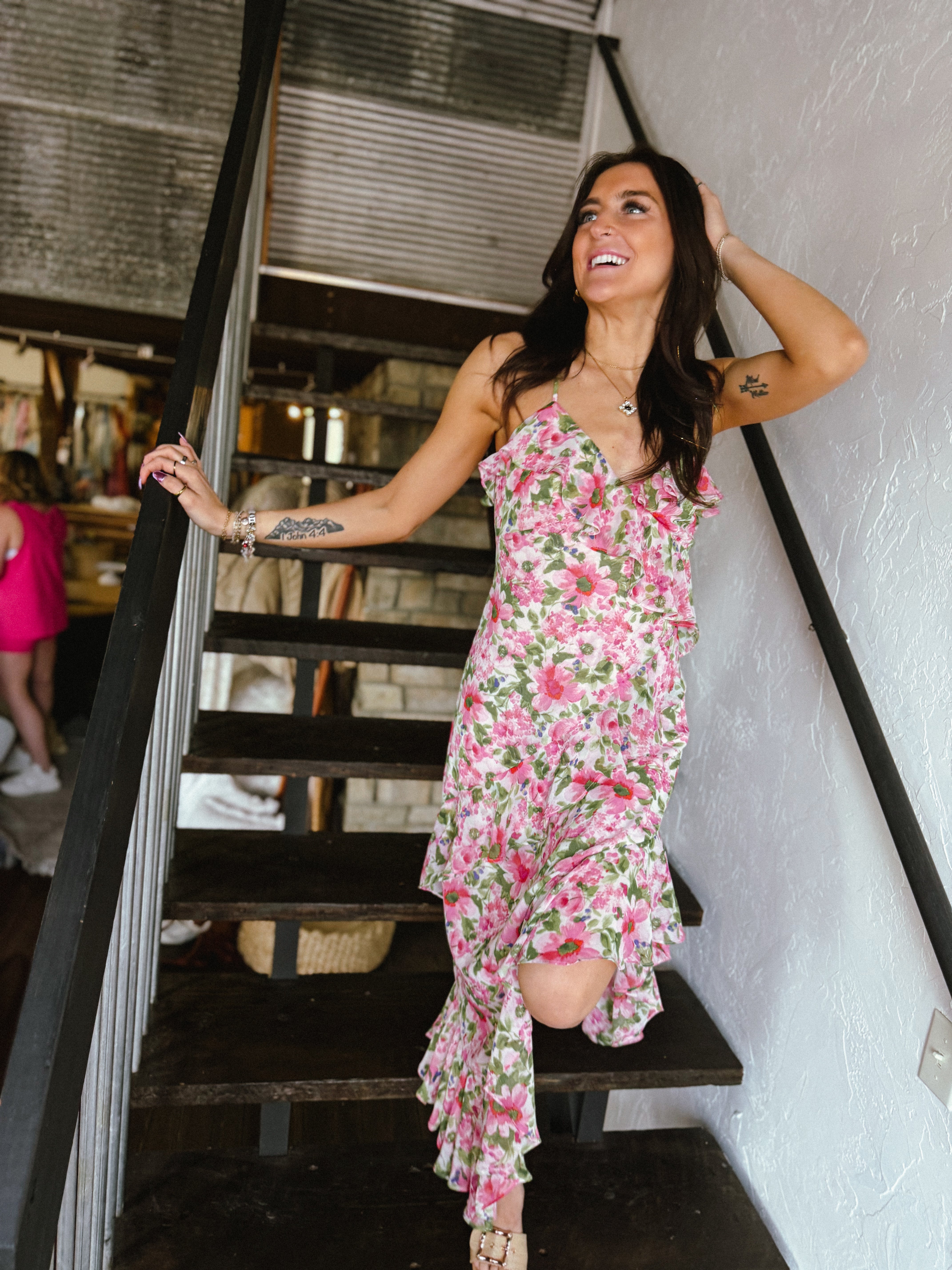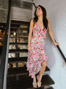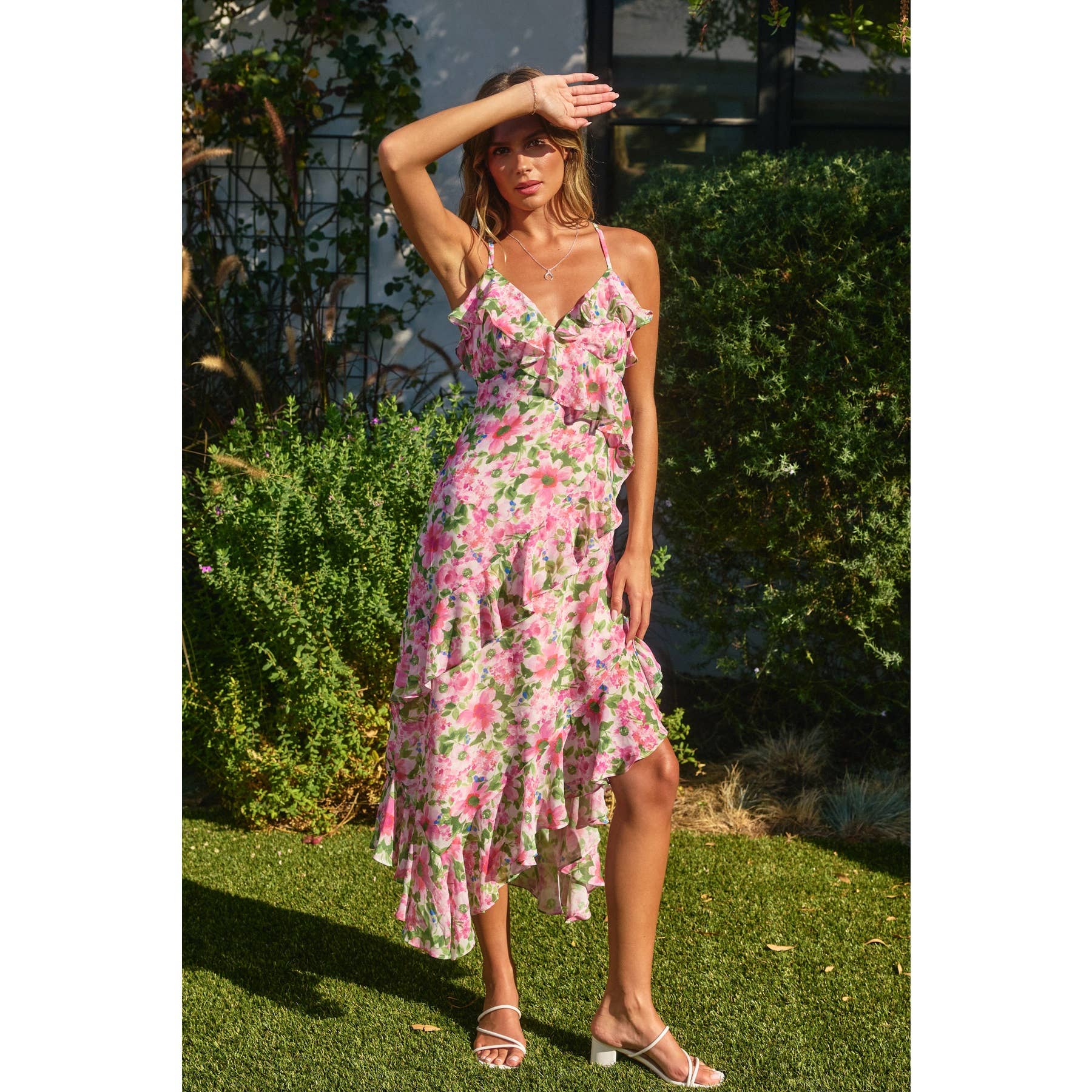Spread love with this playful, floral chiffon midi dress. Featuring a V-neck, criss cross adjustable straps, and diagonal ruffle trim, this dress is perfect for any occasion. With a hidden zip closure and asymmetric hem, you'll feel confident and stylish all day long.