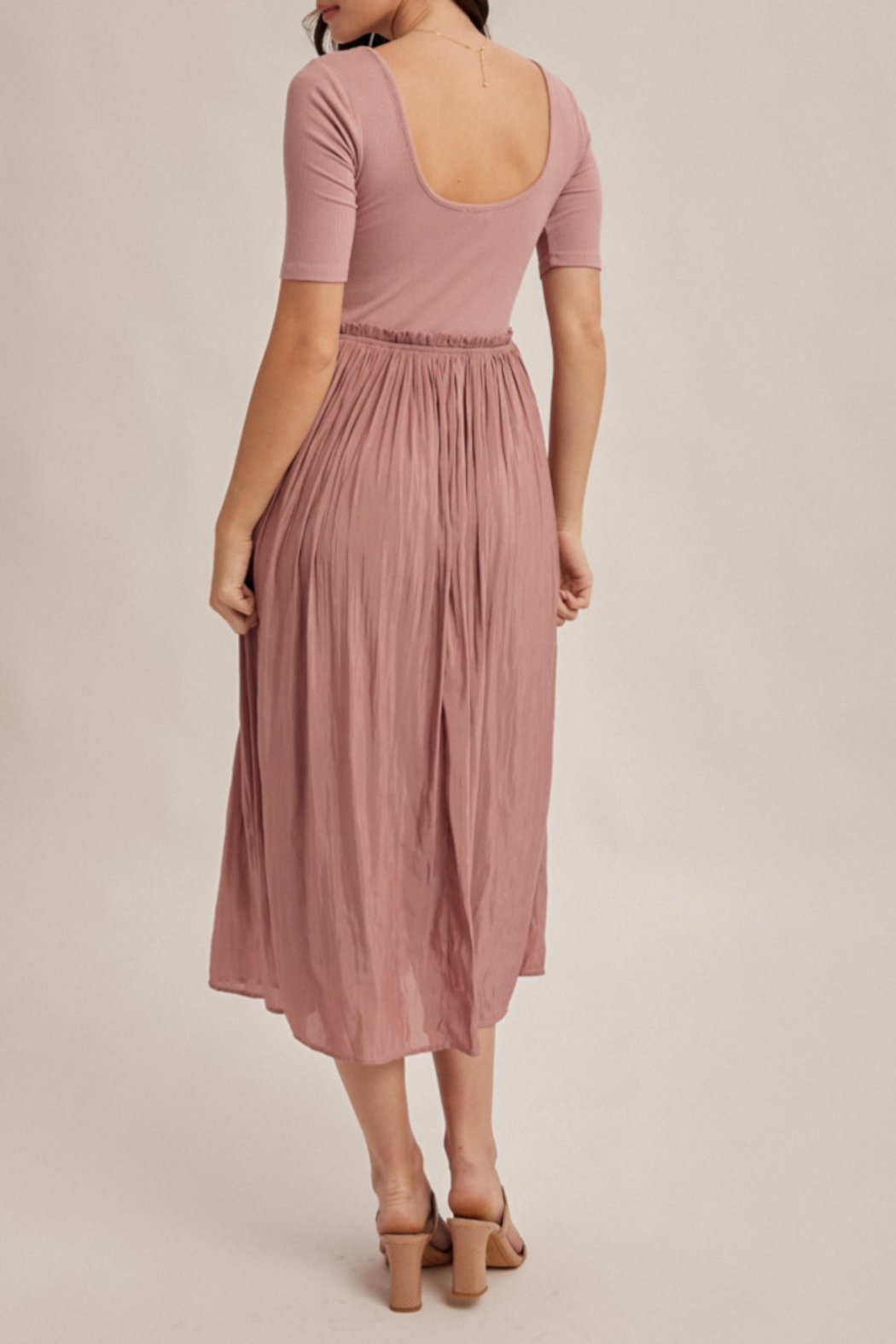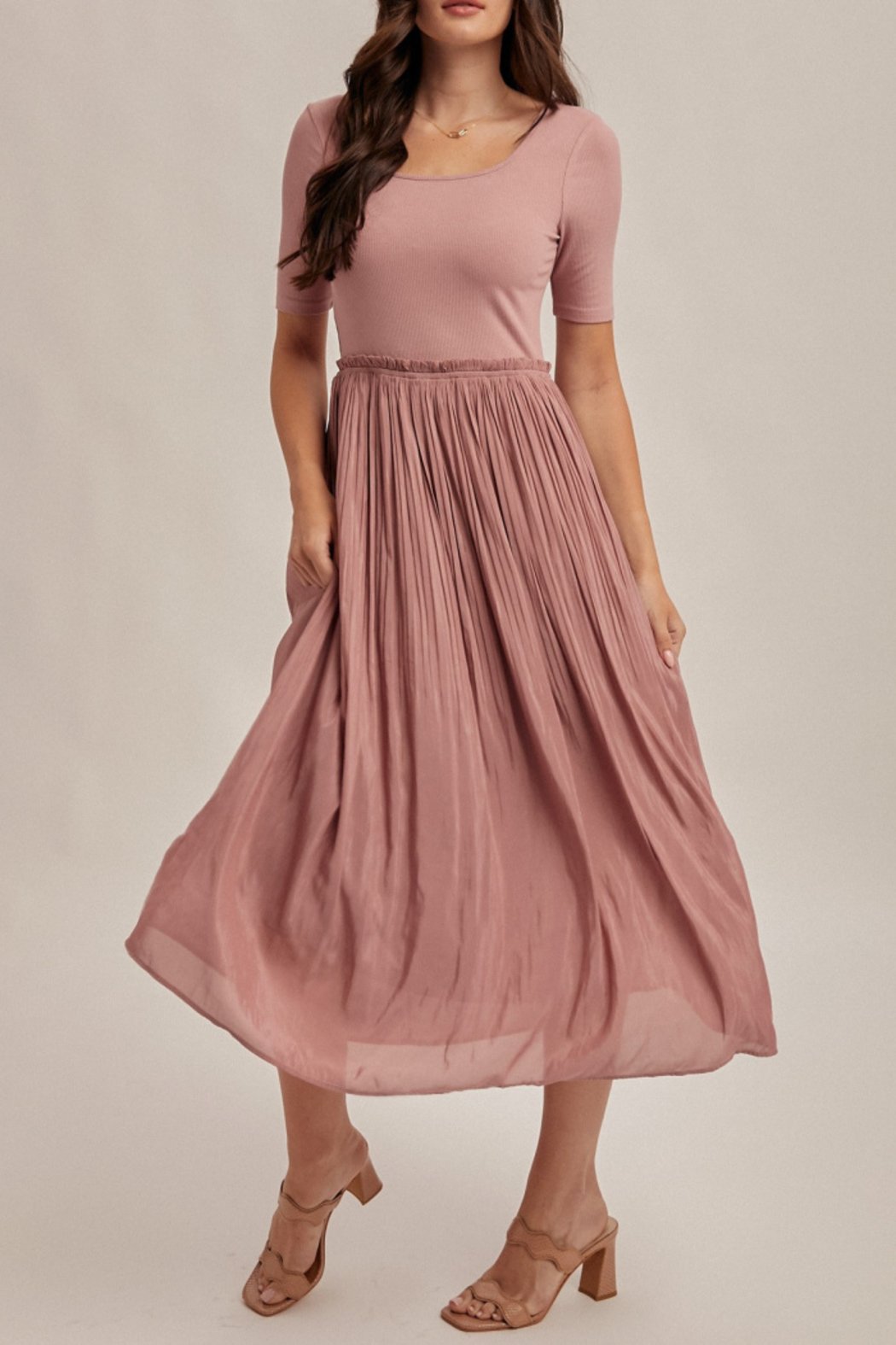 Pleated, skirt dress. Midi length with short sleeve, scoop back, stretchy top. Model is wearing a small. See measurements for your perfect fit. Small: 14.5" across chest, 48" shoulder to hem Medium: 15.5" across chest, 48.25" shoulder to hem Large: 16.6" across chest, 48.5" shoulder to hem *Look for our Darla Cardigan to top off our Serenity Dress for Fall