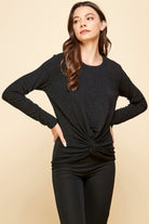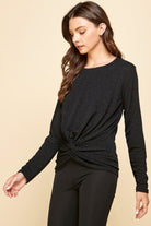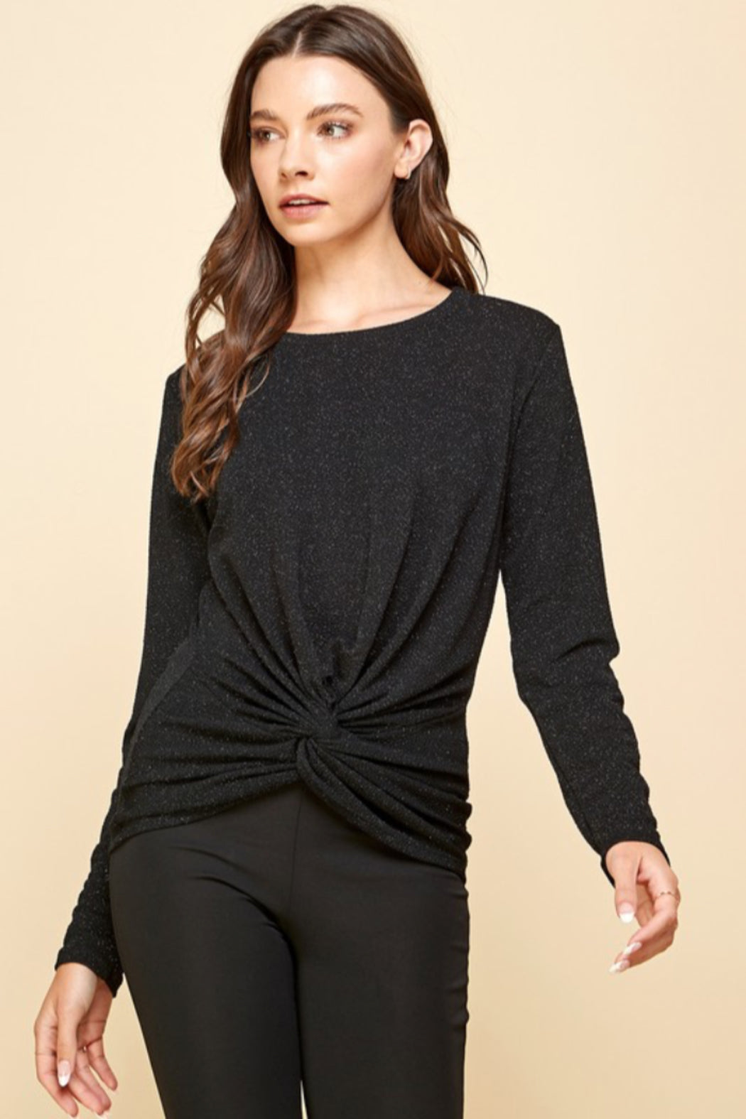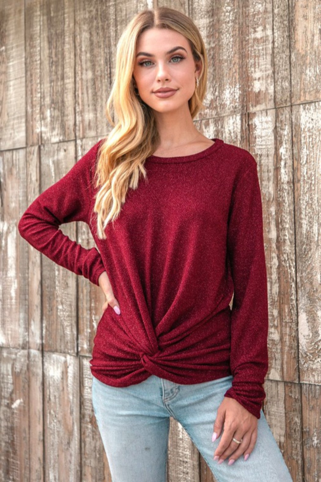 This shimmery front knot top has a touch of sparkle and a relaxed silhouette that elevates casual looks. This Front Knot Top features long sleeves and a crew neckline with a twisted knot detail at the hem. Lightweight, subtly metallic fabric gives it a dressy feel perfect for date nights or evening outings. Pair it with jeans or a skirt for an easy, polished outfit.