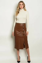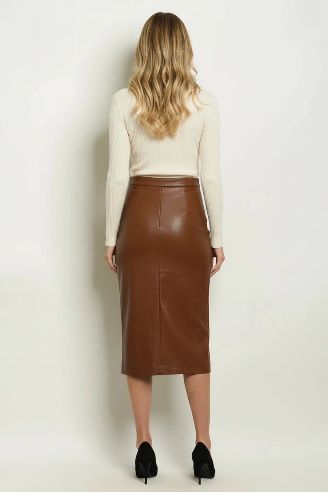 Elevate your wardrobe with this sleek Leather midi skirt. Crafted from high-quality faux leather, this skirt offers a chic and sustainable alternative to traditional leather. Designed with a flattering high-waisted fit, it features a stylish front slit with black buttons detail for added elegance and ease of movement, material has stretch, fleece lined. The midi length provides a versatile option suitable for both professional and casual settings. Pair it with a tailored blouse and heels for a polished office look, or style it with a cozy sweater and boots for a more relaxed vibe. This skirt combines contemporary design with comfort, making it a must-have for any season. Model is wearing size Small L: 29" W: 28" H: 36"