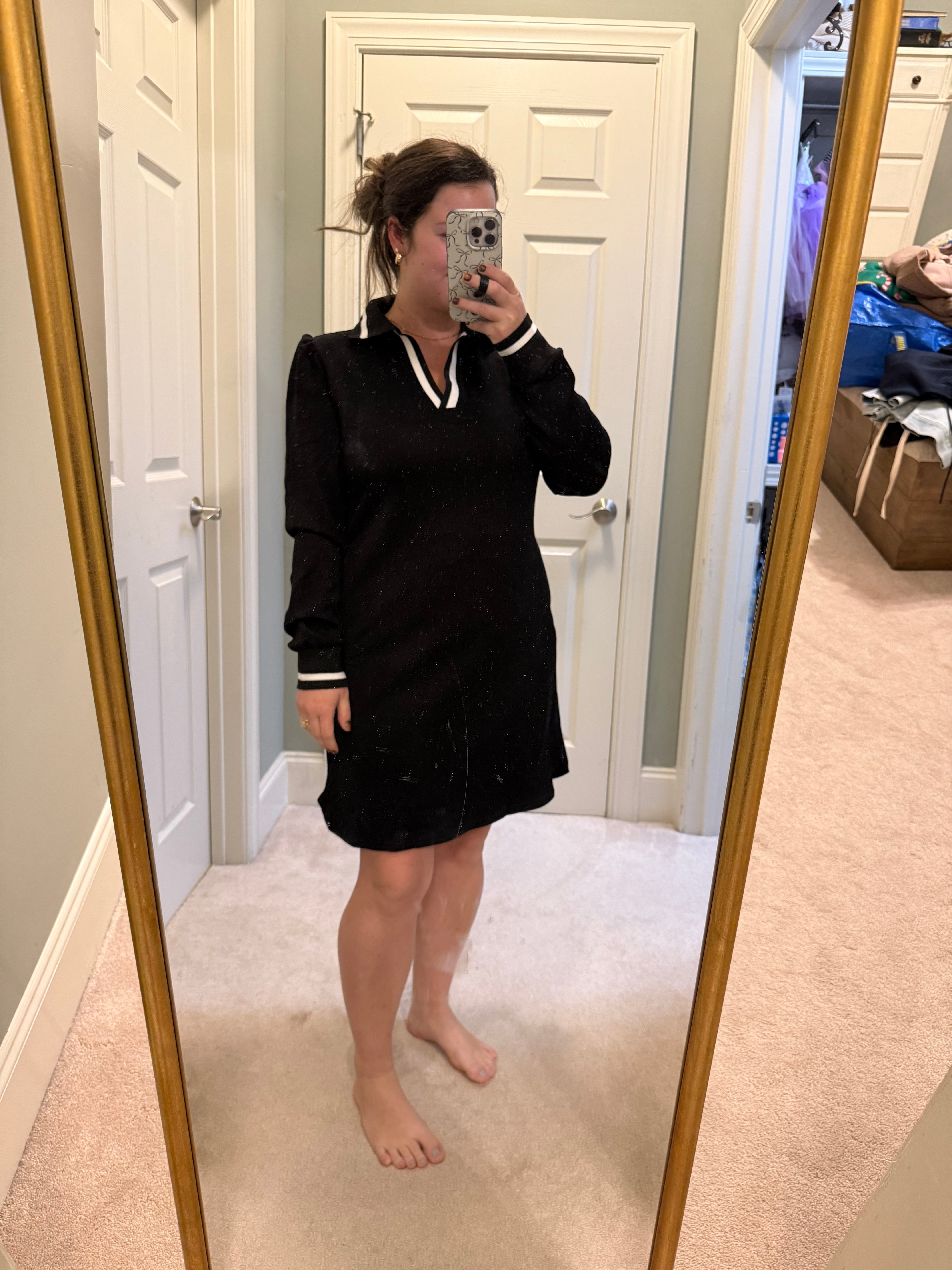 This soft black and white dress is a true-to-size fit, made with stretchy material for ultimate comfort. Its flattering design pairs perfectly with convenient pockets for storing small essentials. Look and feel great in this stylish and practical dress.