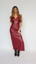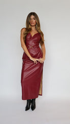 Make a bold statement with the Steve Madden Kailey Faux Leather Maxi Dress. Crafted from sleek, high-quality faux leather, this burgundy maxi dress features a flattering silhouette enhanced by a self-tie belt with gold hardware that cinches the waist for a feminine shape. Its floor-length design and edgy yet elegant finish make it perfect for evening events, date nights, or special occasions. Pair with heels and minimal accessories for a head-turning look.