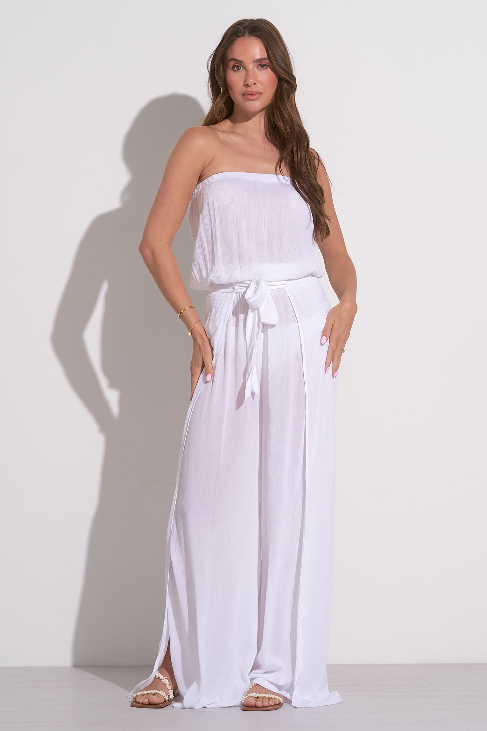 Elevate your wardrobe with this elegant strapless jumpsuit, designed for a look that’s both effortlessly chic and comfortable. The strapless silhouette is perfect for showing off your shoulders, while the flowy wide-leg pants add a breezy sophistication to your ensemble. A removable fabric tie belt accentuates the waist for a flattering fit, and side slits on the legs add a touch of playful movement. This jumpsuit is ideal for vacations, summer outings, or casual evening events, offering a versatile style that transitions seamlessly from day to night.