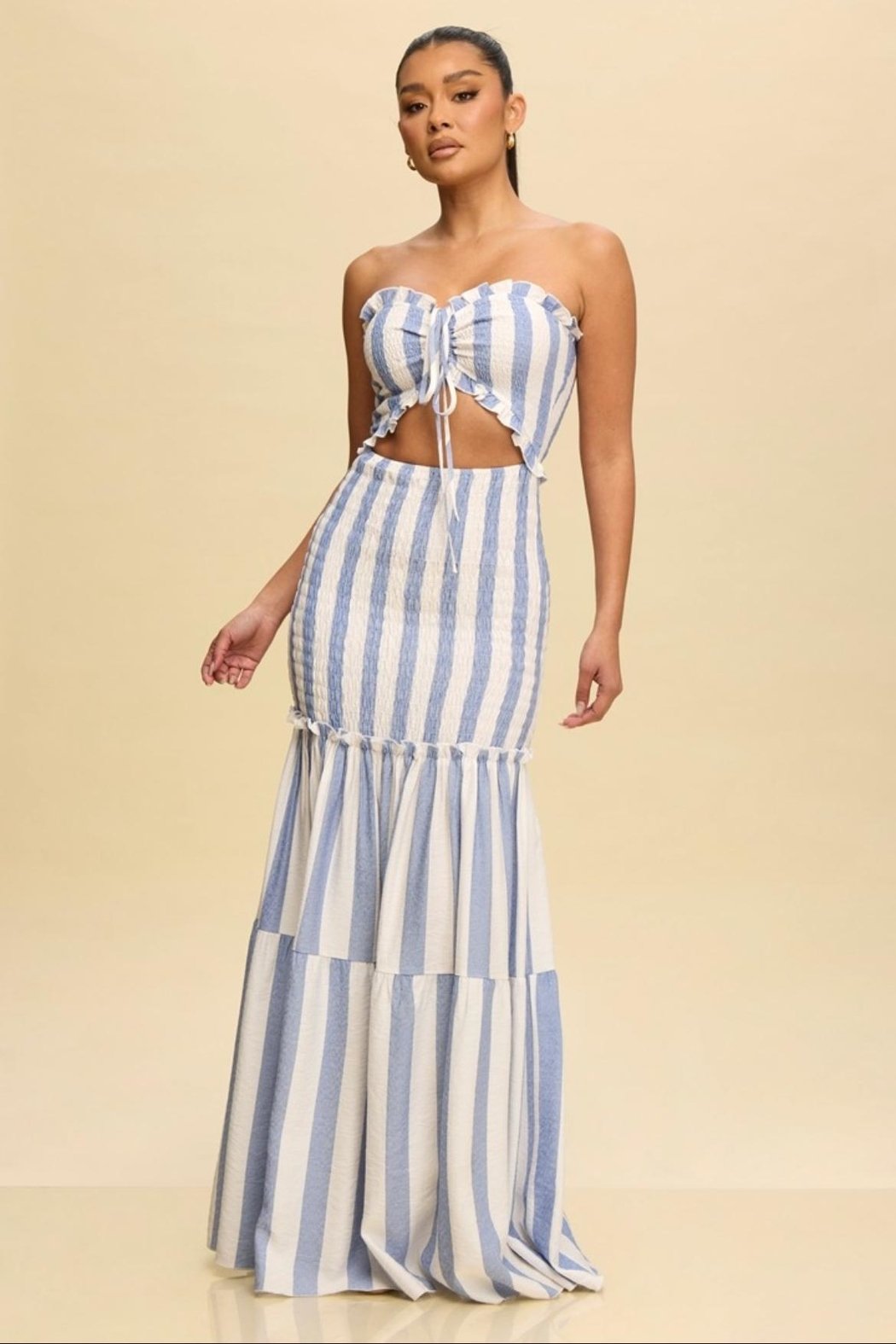 Striped scrunch cut out front strapless maxi dress. Model is wearing a size Small