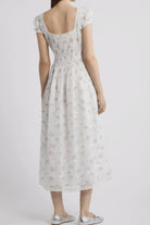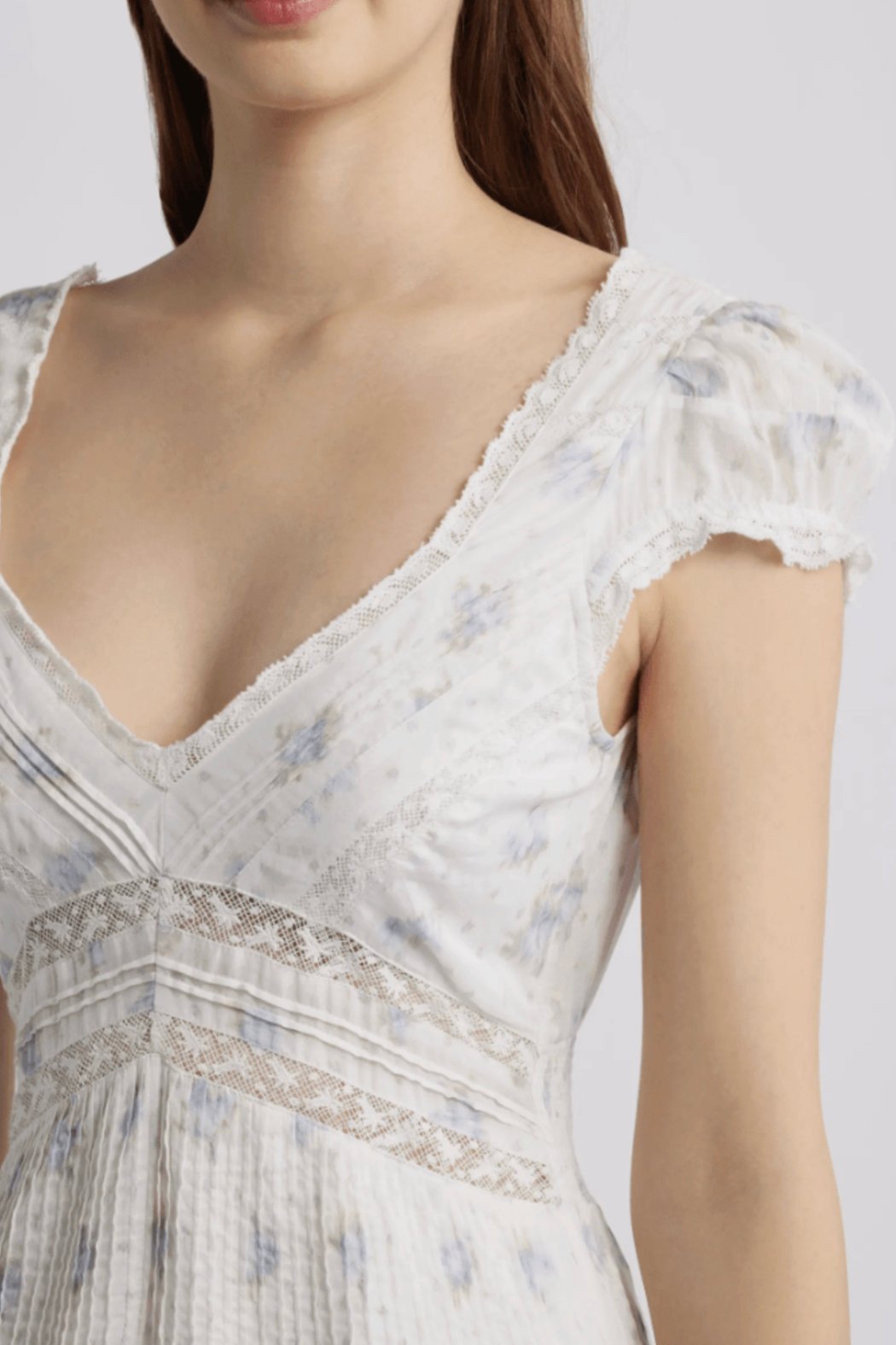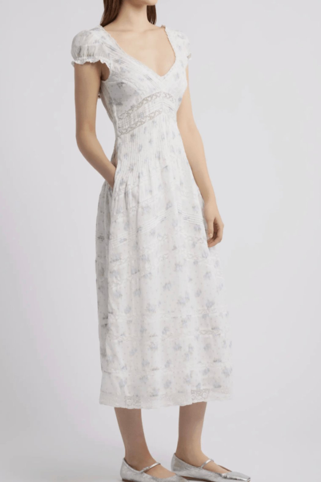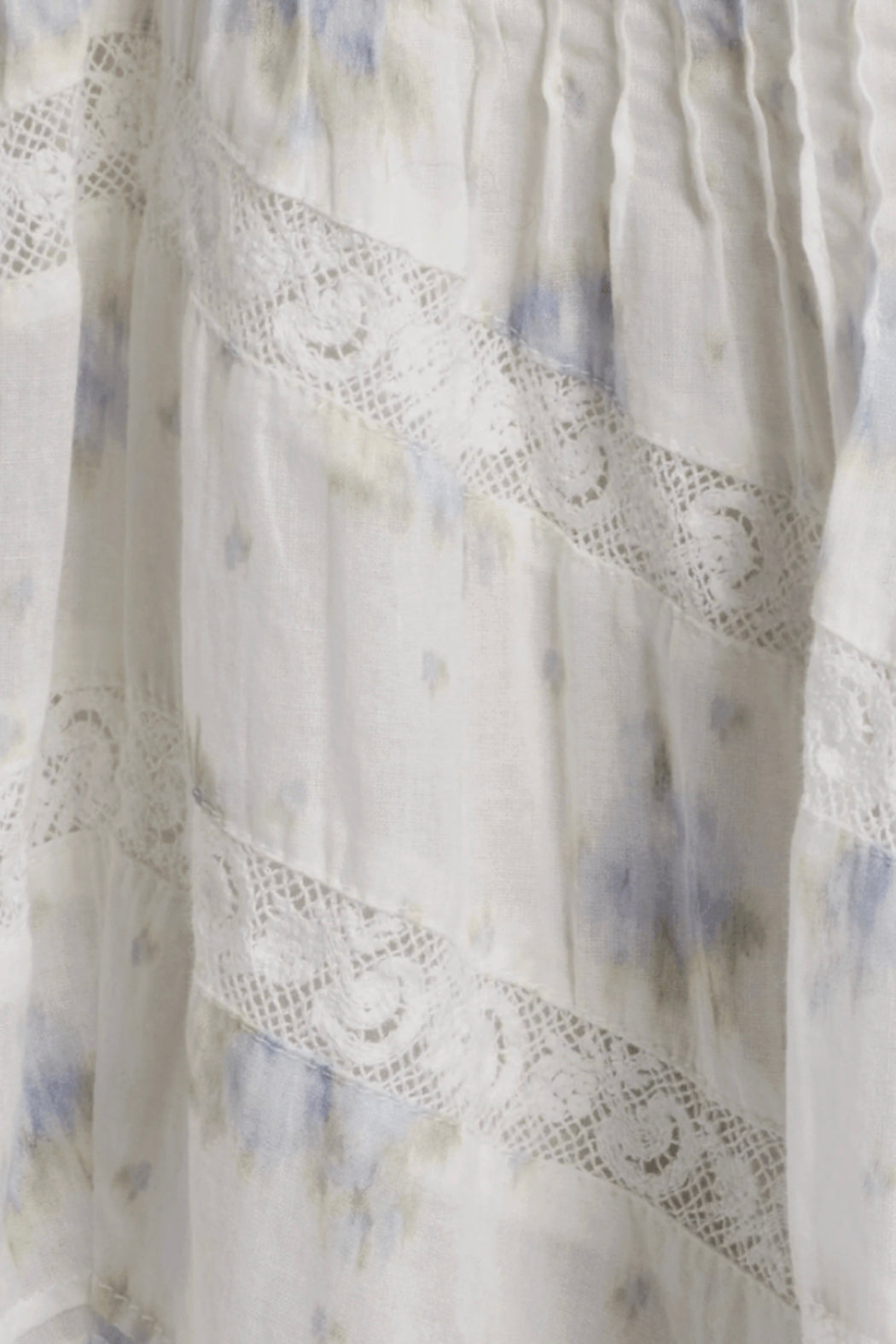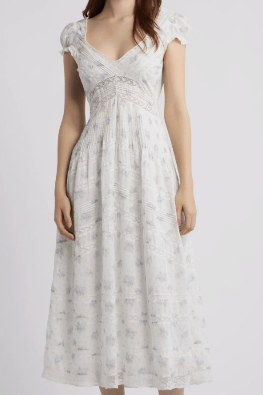 Lovely lace and crisp pintucks sweetly texture this cotton maxi framed by slight puff sleeves and a perfectly flared skirt.