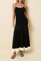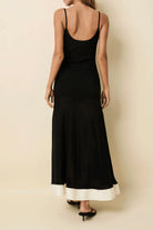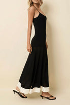 The Tess Dress in Noir and Brule blends timeless elegance with contemporary design. Crafted from a mix of opaque and sheer viscose fabrics, this maxi dress features a scoop neckline and drop waist that flares into a loose, flowing skirt. This refined and chic silhouette is perfect for any occasion.