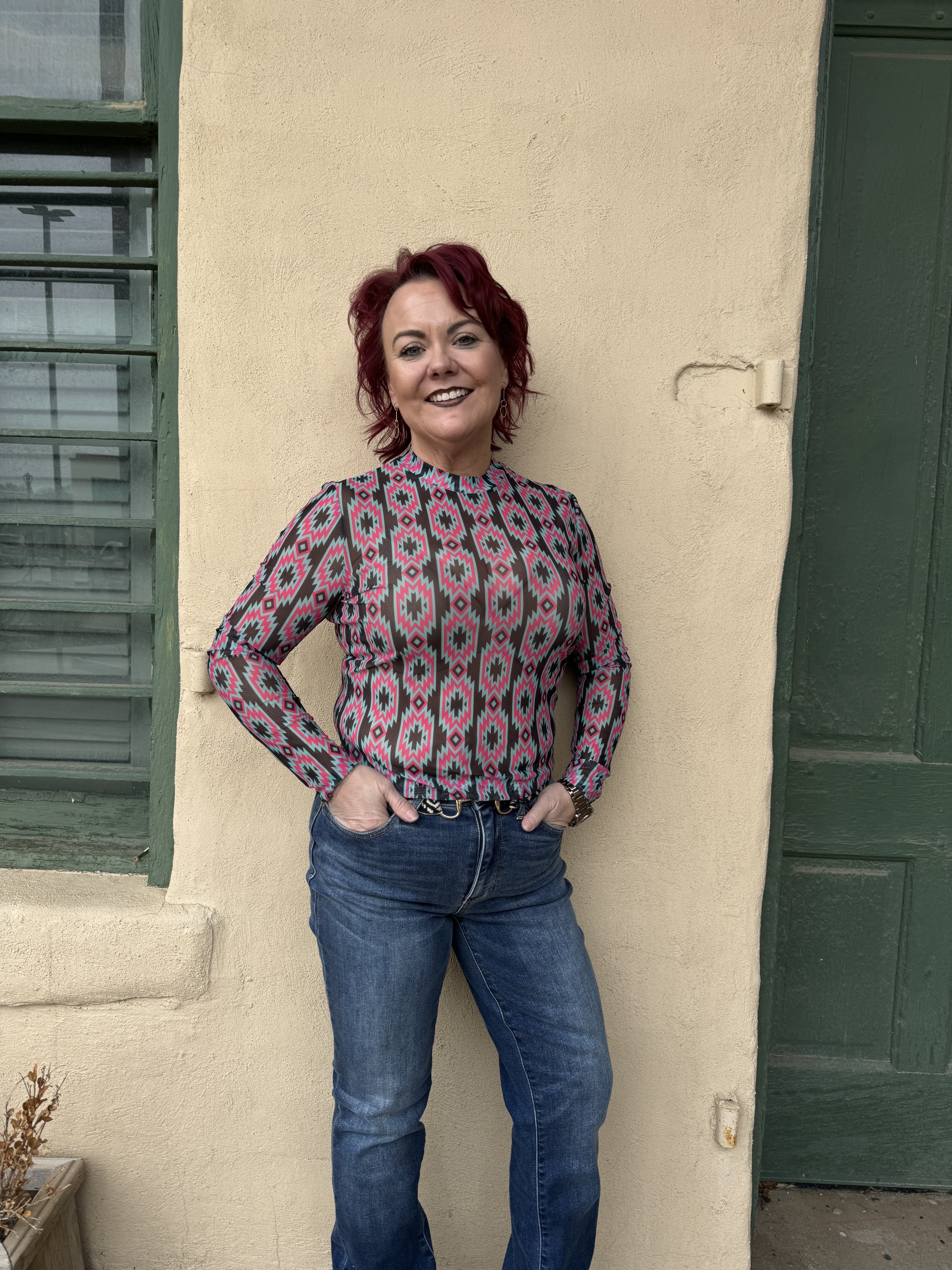Channel your inner cowboy and take risks with the Tess Pink Aztec Print Mesh Top. Featuring a daring cowboy print and sheerish mesh, this long sleeve boho-western top is sure to turn heads and inspire courage. Take the road less traveled and let your unique style shine!