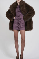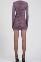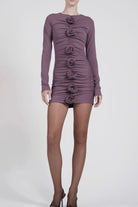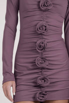 The Luma Dress is a long-sleeve mini cut from a smooth stretch fabric that contours the body with comfortable ease. Intentional ruching enhances the shape, while a row of sculpted flower details run down the center front—adding dimensional texture and a romantic, couture-inspired touch.