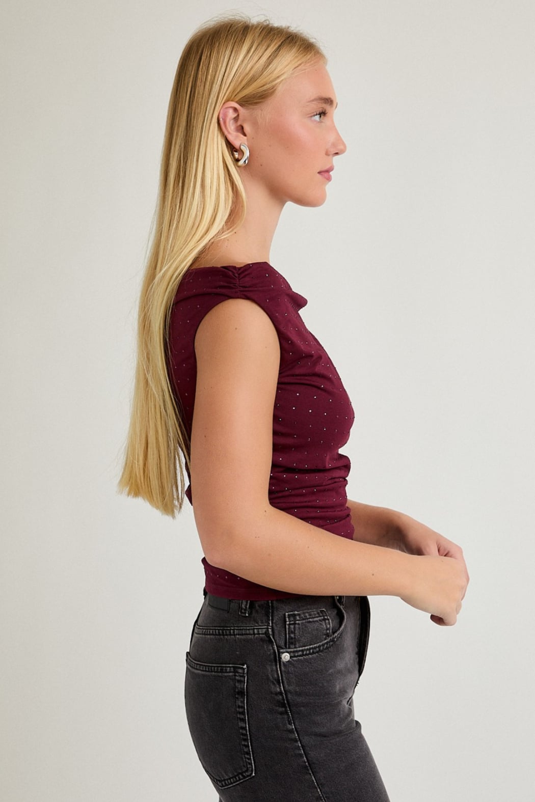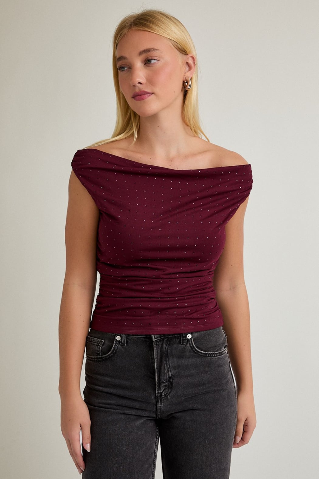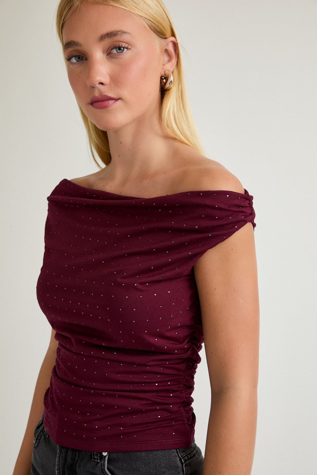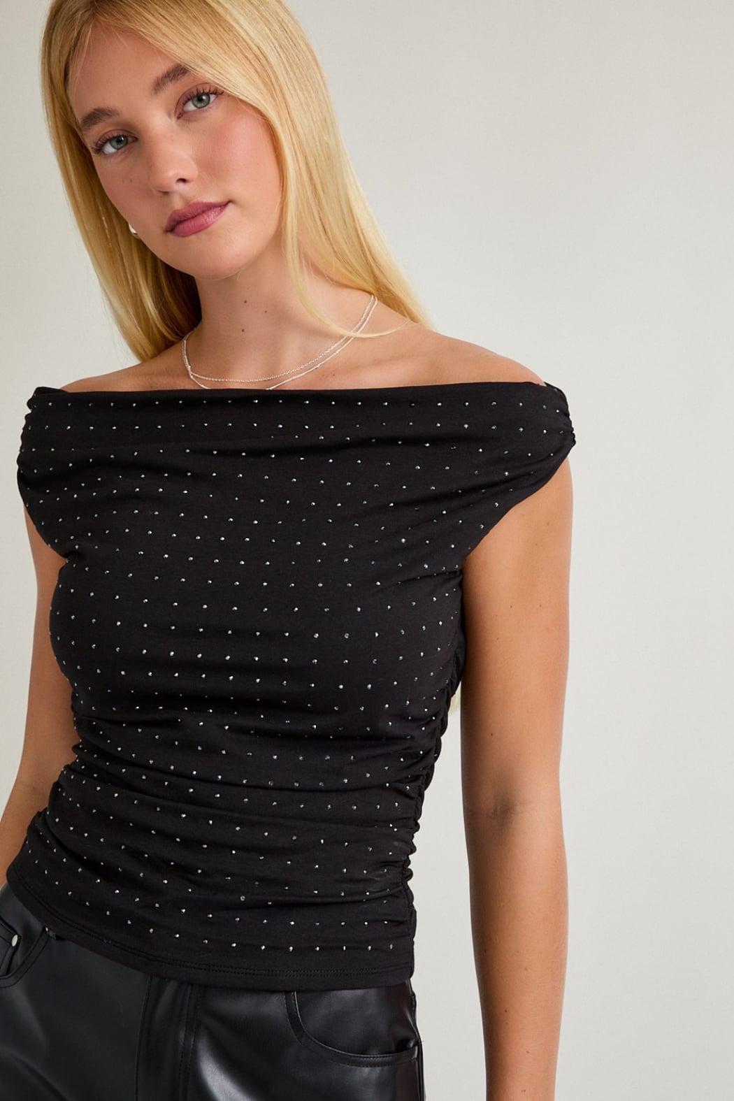 Give your going-out lineup a little sparkle with this off-the-shoulder rhinestone top. The soft, stretchy fabric hugs just right, while the draped neckline sits effortlessly across the shoulders for that wow vibe. Perfect for dinner dates, girls' nights, holiday parties, and any moment you want a low-effort glam boost.