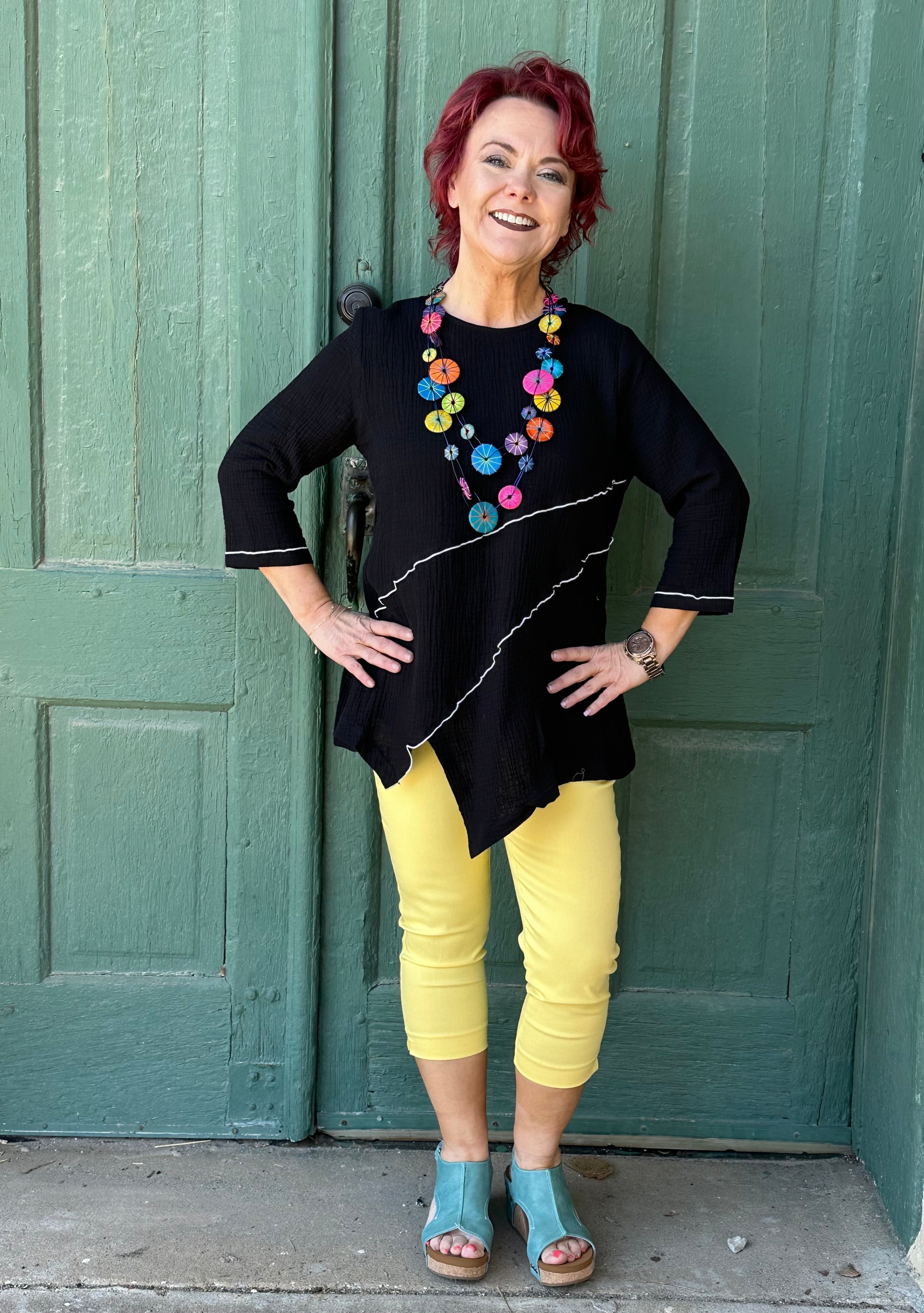 Look your best while feeling comfier than ever in the Tressin Pullover Top! Its lightweight cotton gauze material and breezy A-line cut will keep you cool all day, while the stylish 3/4 sleeves and classic white piping give you a timeless, fashionable look. Let's hear it for fashionable comfort!