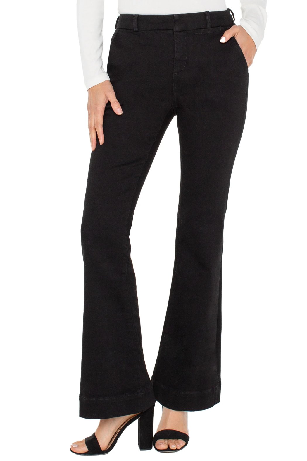 These denim trousers are designed with a wide waistband to enhance comfort and style. Crafted from rich, black denim, these offer a sleek, polished look. Perfect for versatile styling, discover timeless sophistication with every wear. DETAILS: 32" Inseam Mid-rise 9-1/4" Front rise; 21-1/2" Leg opening Set-in waistband with belt loops Wide waistband Zip-fly with hidden hook and eye closure Slanted side pockets and faux welt back pockets WASH INSIDE OUT/WASH SEPARATELY/MACHINE WASH COLD/ONLY NON-CHLORINE BLEACH WHEN NEEDED/TUMBLE DRY LOW/COOL IRON IF NEEDED/DRY CLEAN