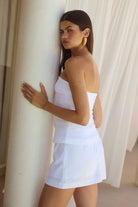 Our Milly Top draws from timeless suiting styles, showcasing a strapless neckline, elegant gold seashell buttons, and a tailored fit that offers a modern, refreshing vibe.