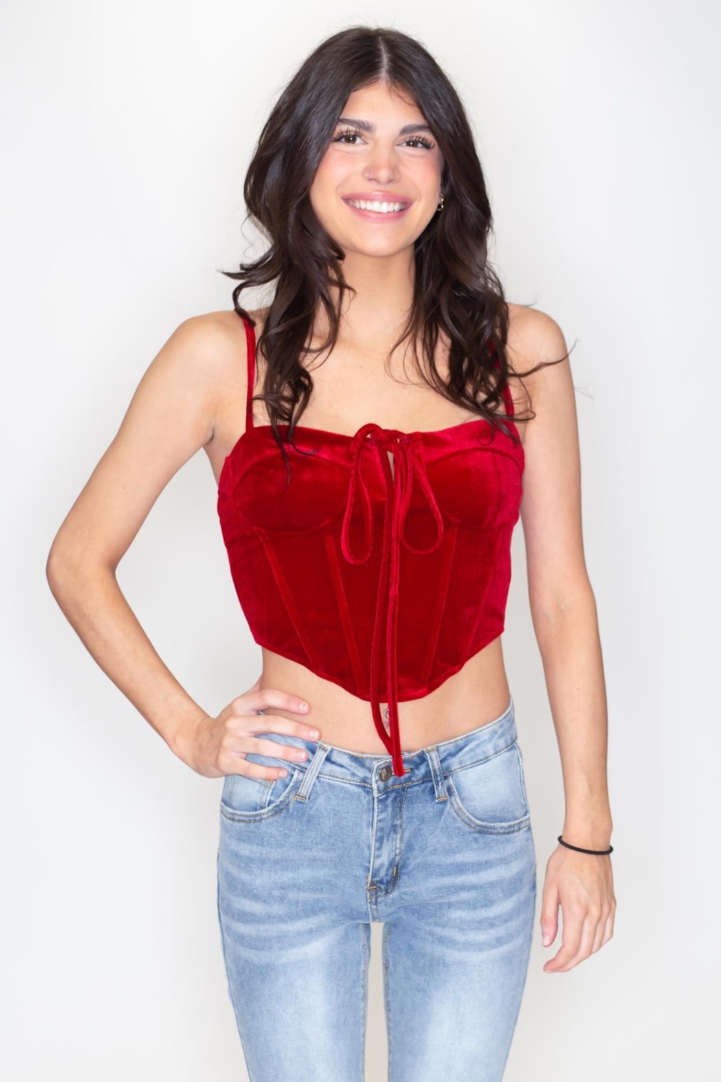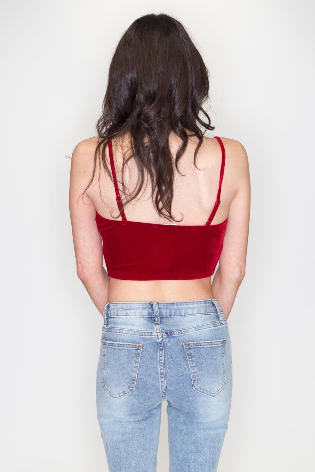 Red velvet halter top. Wear as a halter or tied down as a front bow.
